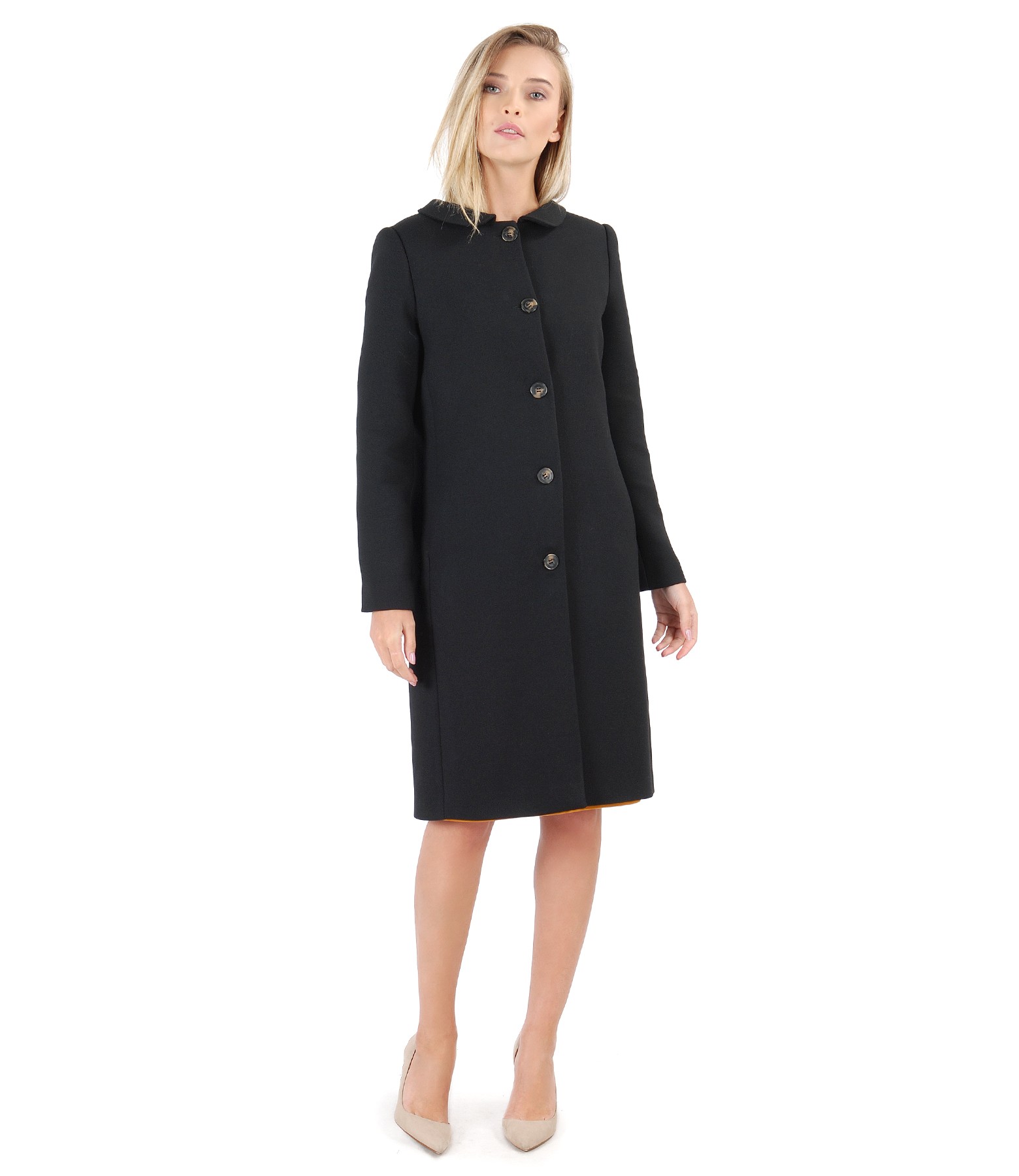 Elegant jacket, padded, with round collar and side pockets. Closes with 5 front buttons.