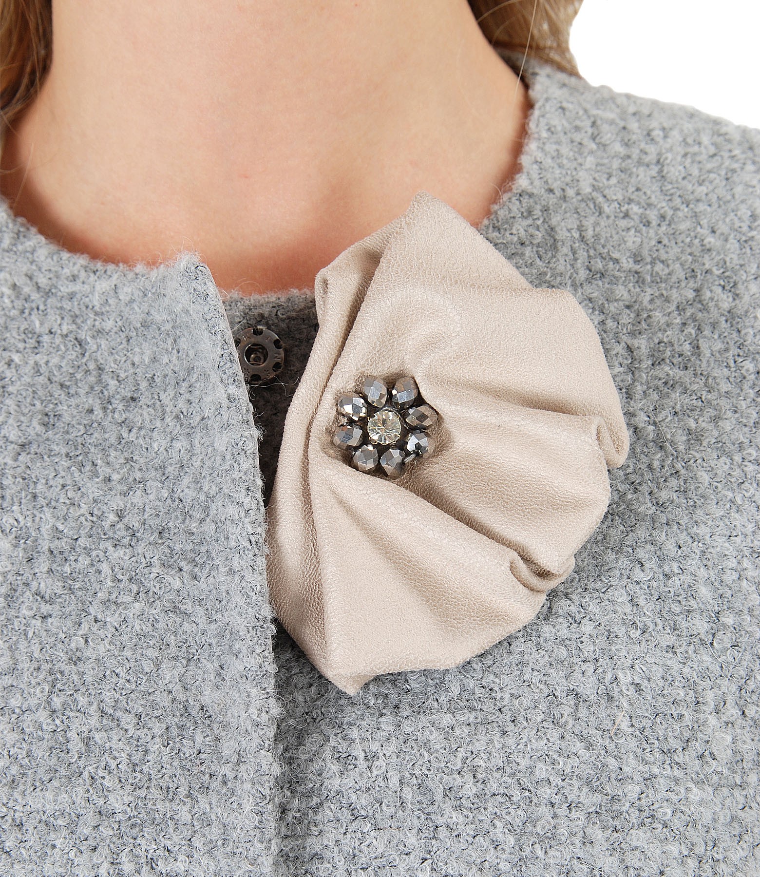 Jacket without collar, made of wool and alpaca, padded, with detachable accessory brooch embellished with crystals on the right side. Closes with 5 front staples.