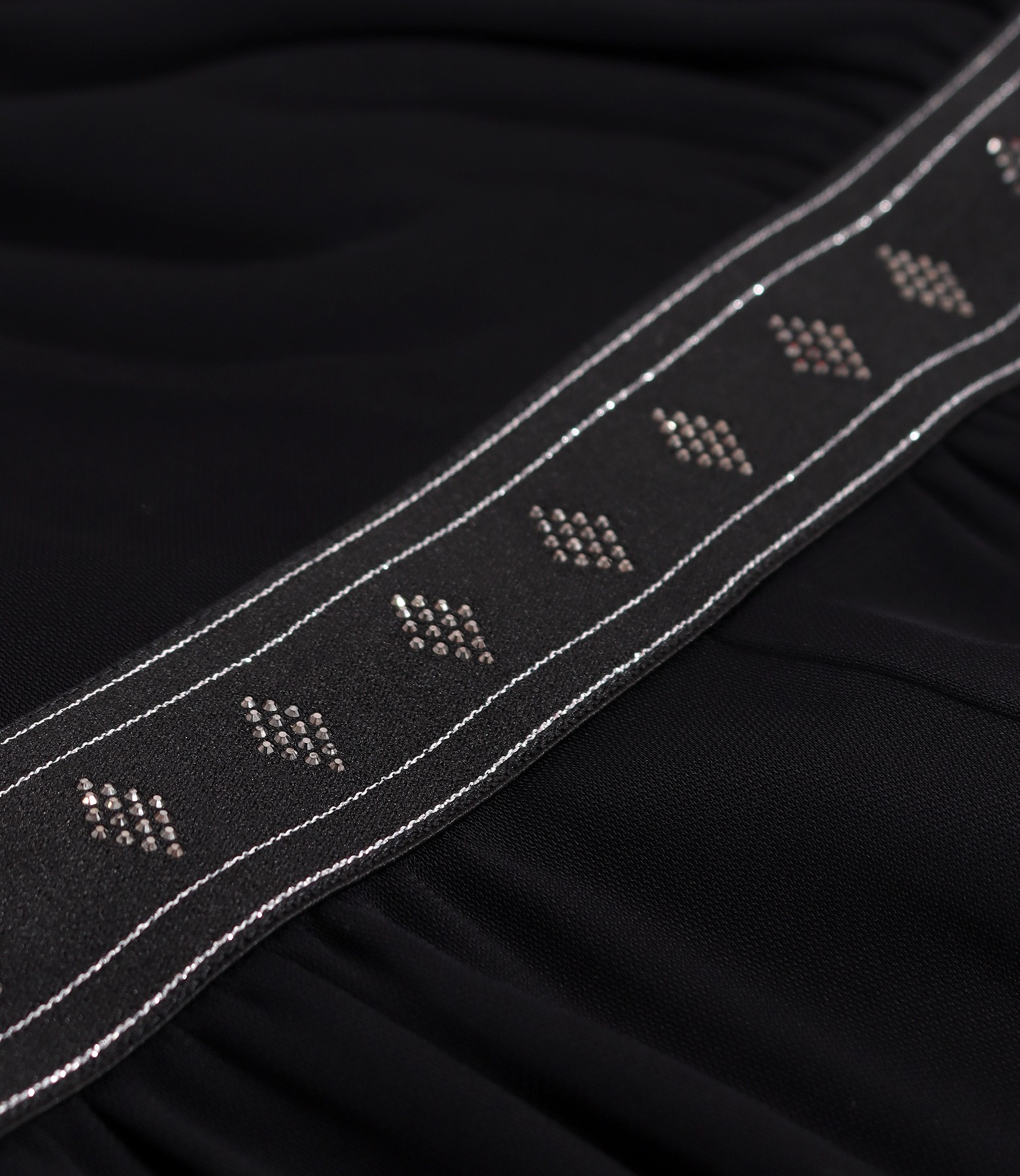 Elegant jumpsuit made of viscose, unlined, with a decorative elastic waistband, side pockets, and a dropped sleeve. The bodice is lined. It fastens with a concealed zipper at the center back.