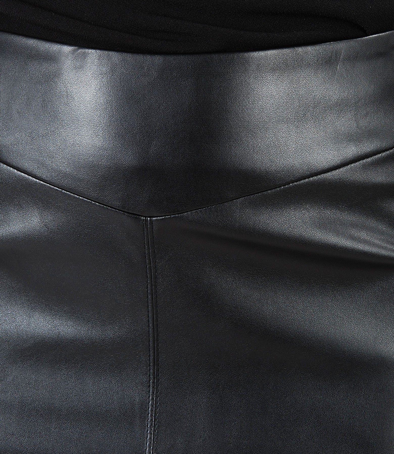 Elegant eco leather skirt with front zipper, padded, with front zipper. Closes with hidden zipper on the middle back.