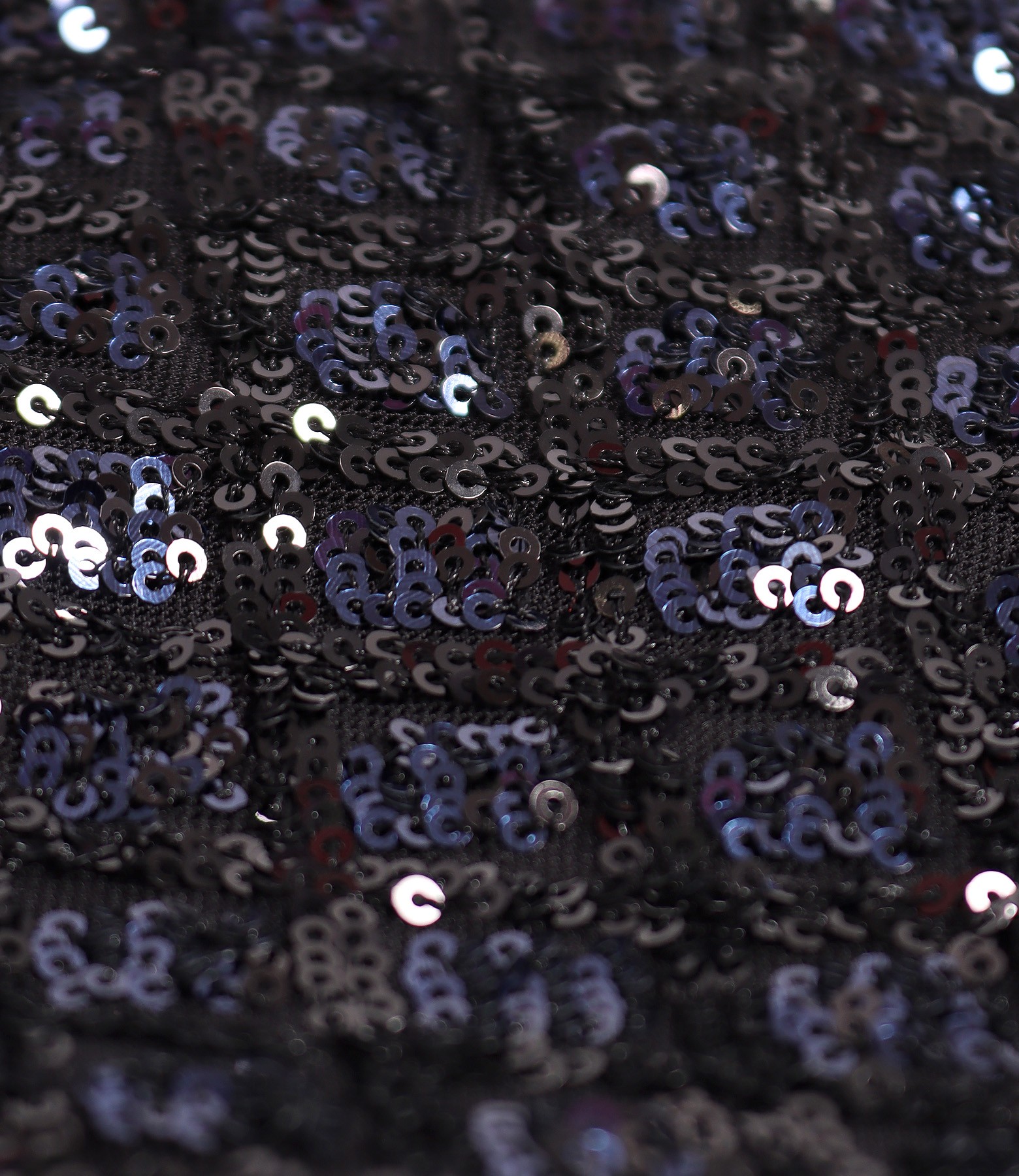 Elegant long veil dress with sequined bodice and sleeves, lined with satin. It has a detachable veiled waist cord and a round neckline. It closes with a hidden zipper at the center back.