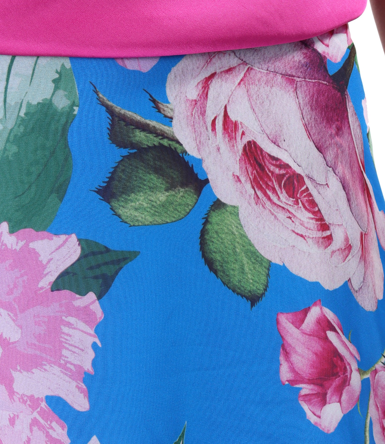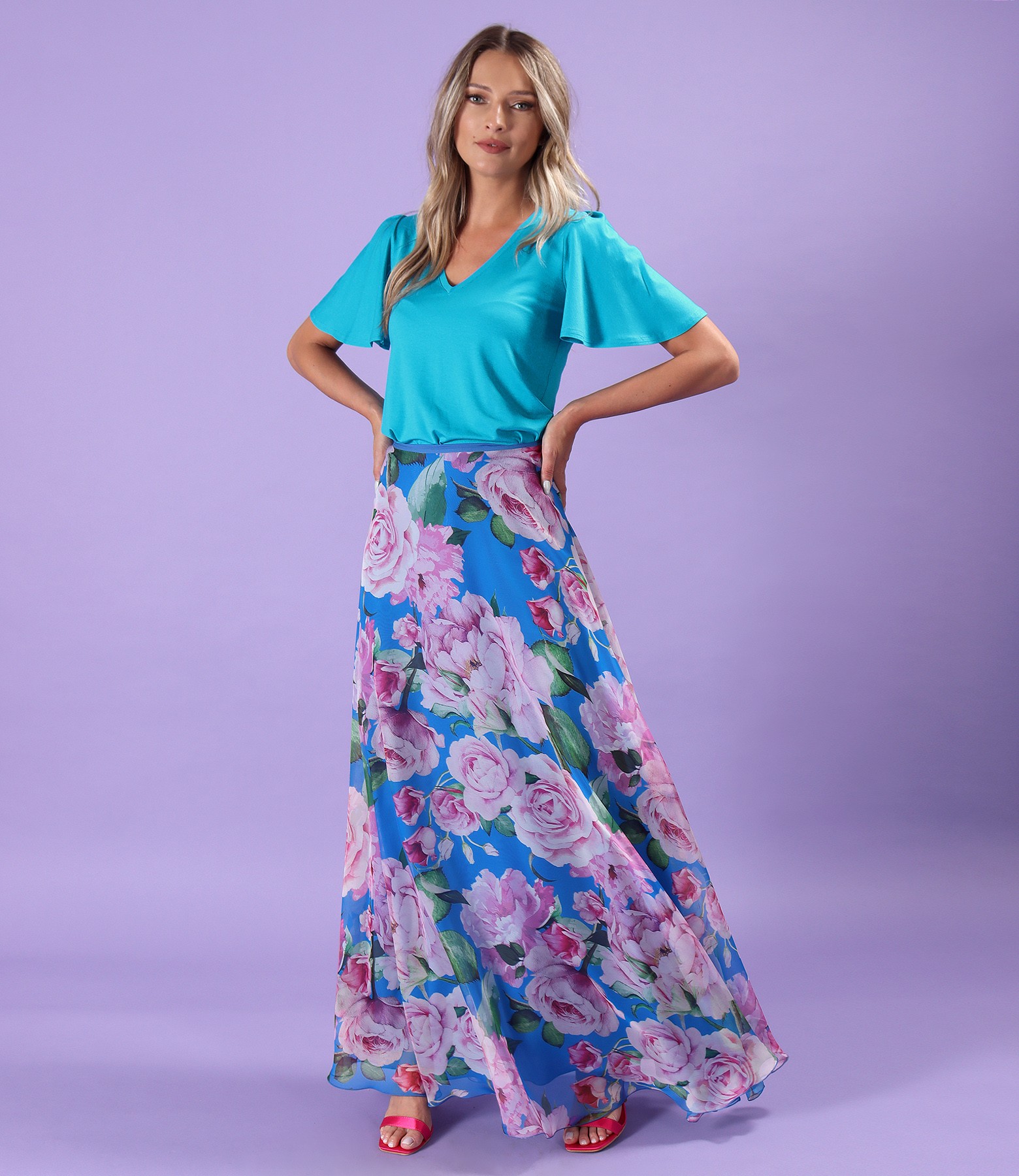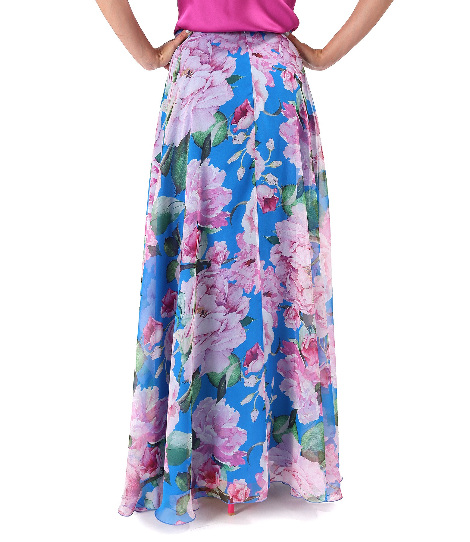 Elegant long voile skirt printed with floral motifs (Blue), size
