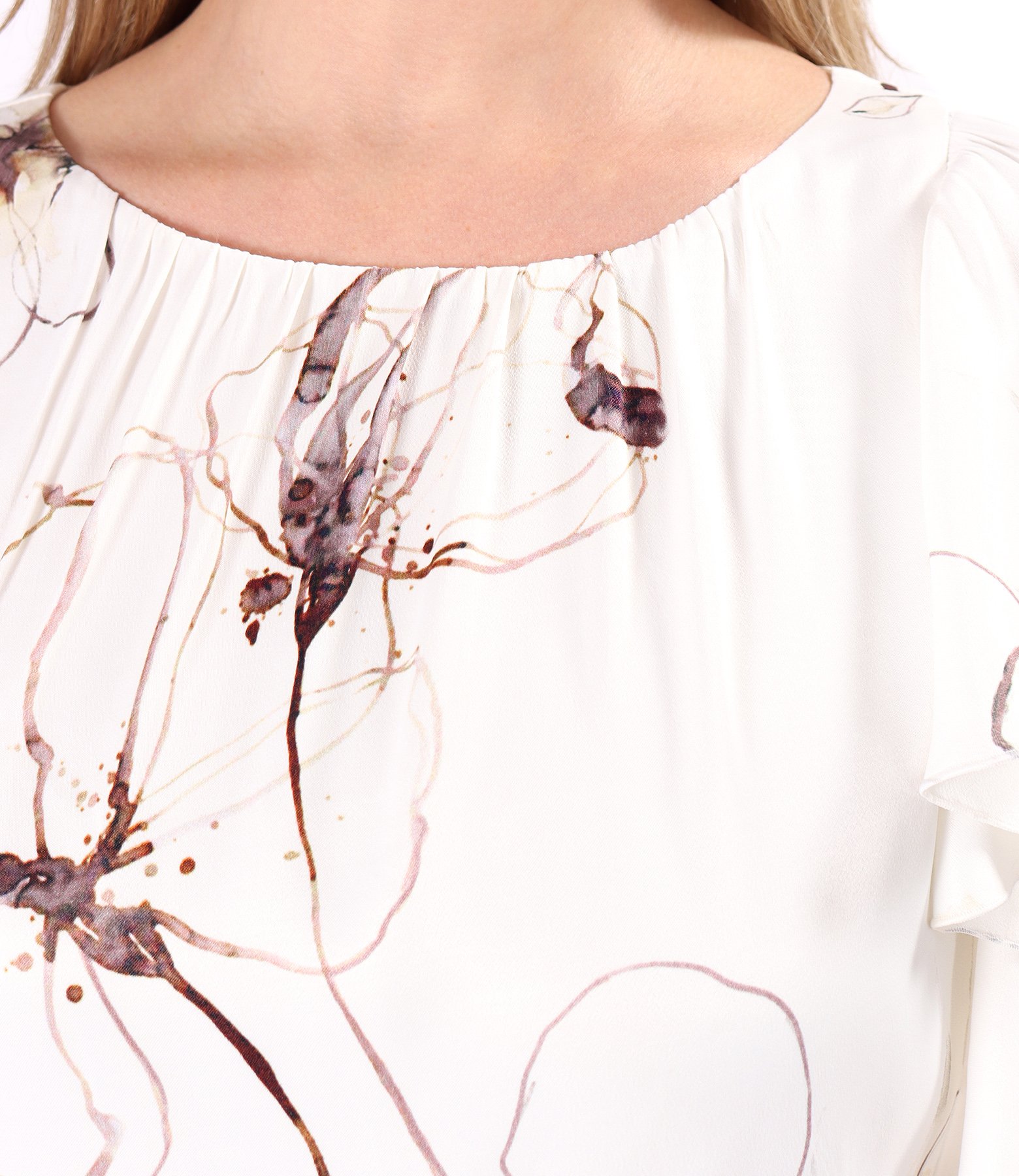 Elegant midi dress made of satin viscose printed with oversized floral motifs, with a round neckline and ruffles on the shoulders. It closes with a hidden zipper at the center back. The position of the print varies per product.