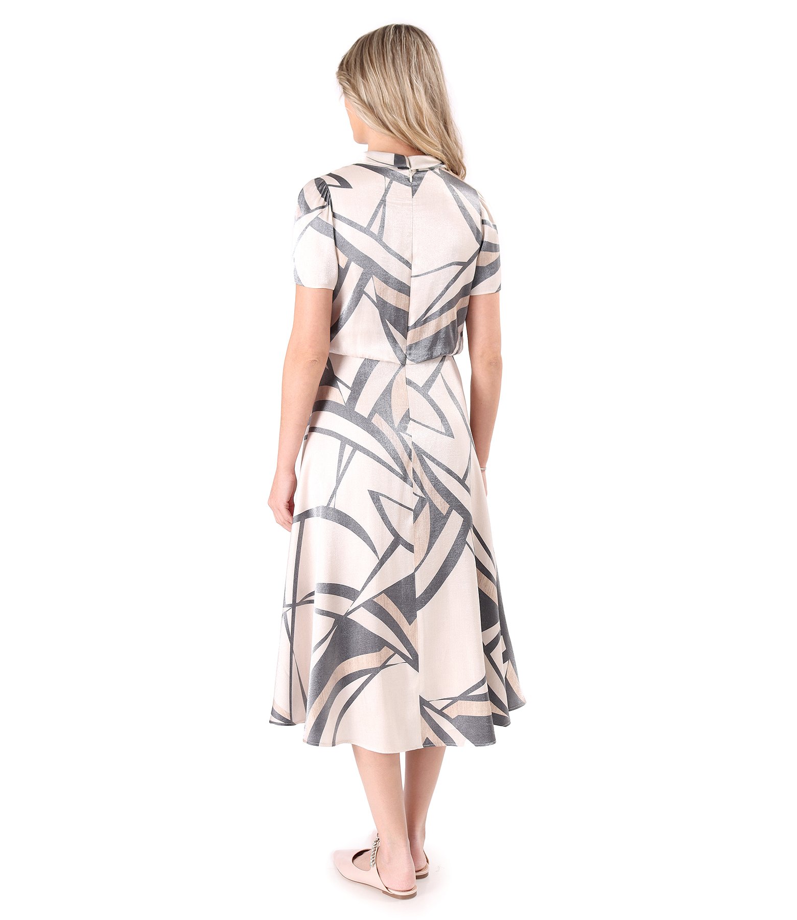 Elegant midi dress made of satin viscose printed with geometric motifs (Beige), size