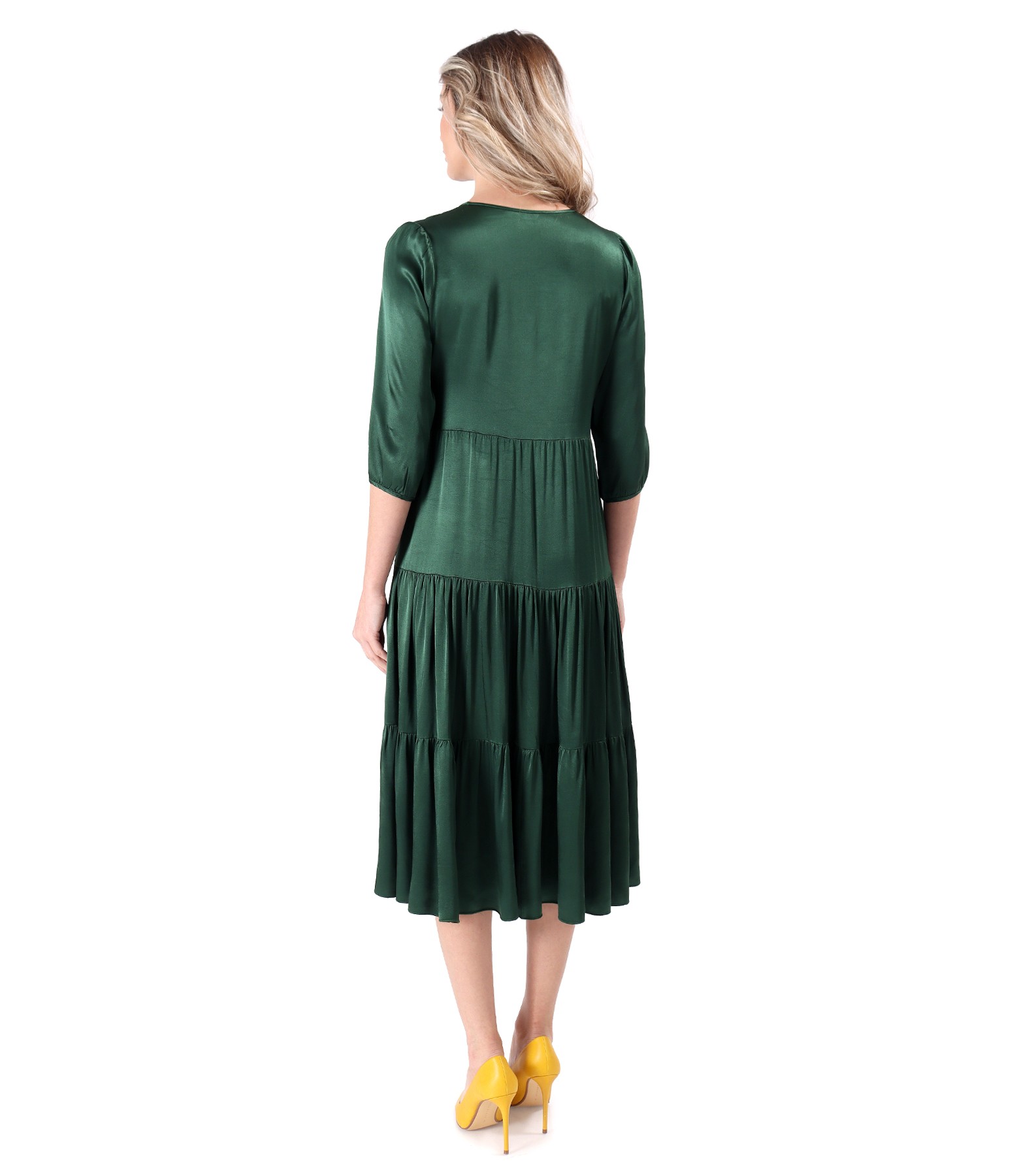 Elegant midi dress with ruffles in viscose satin (emerald green), size