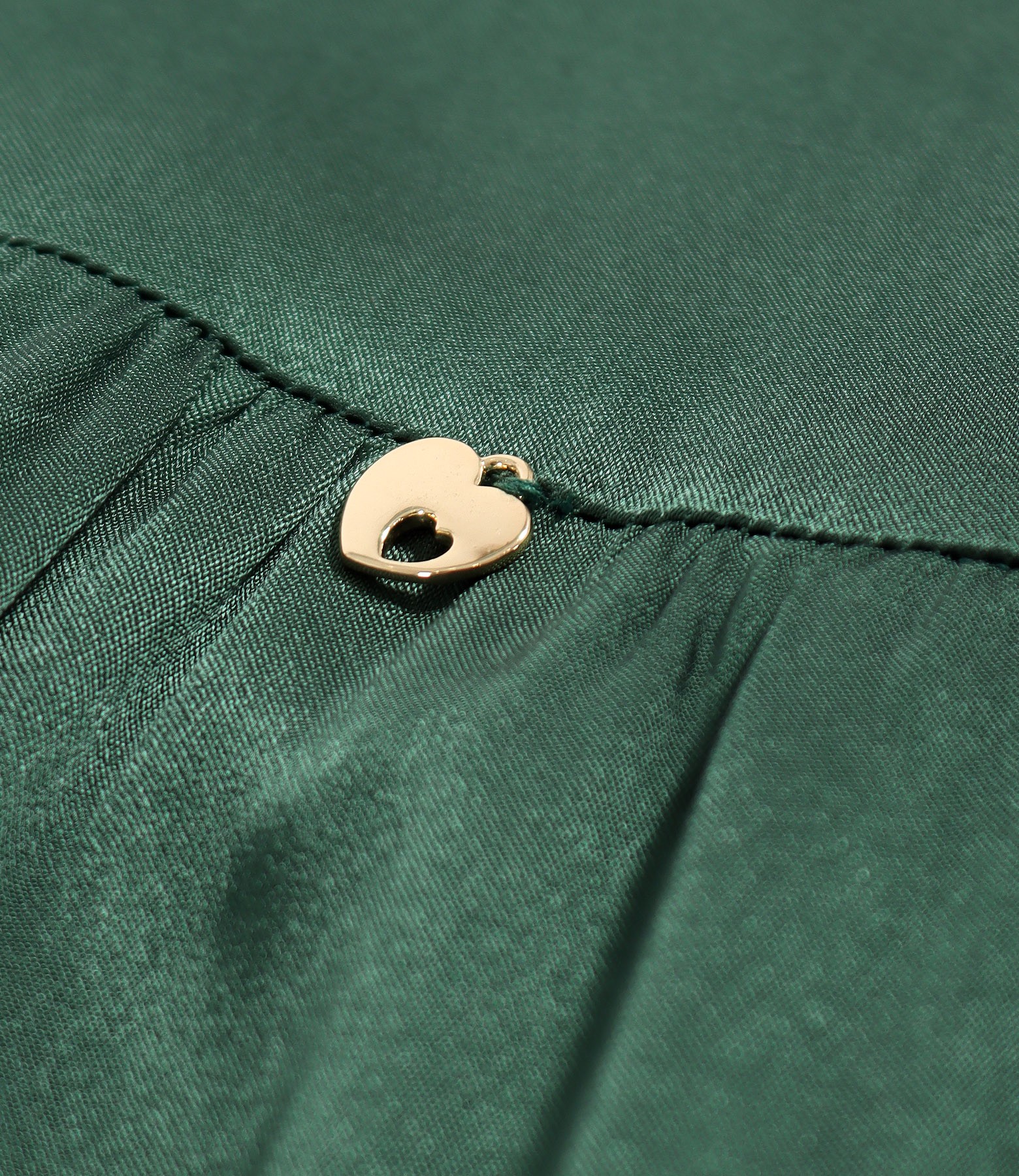 Elegant midi dress with ruffles in viscose satin, with V-neckline, 3/4 sleeves, side pockets, and decorative metallic heart at the waist.