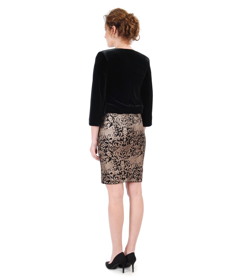 Midi dress made of elastic velvet with golden print, padded, with round low-cut neck and short sleeves.