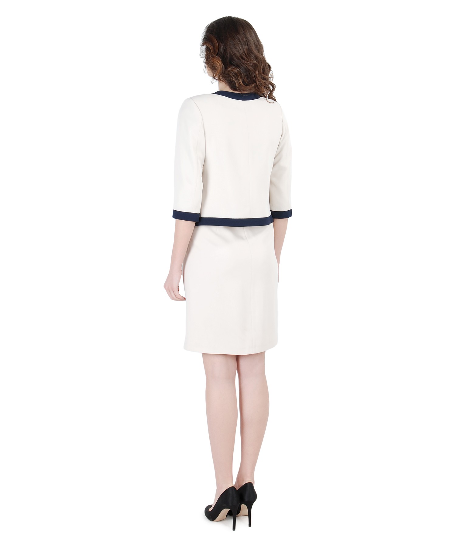 Elegant bolero, 3/4 sleeves and applied pockets with contrast trim and bow on right pocket.