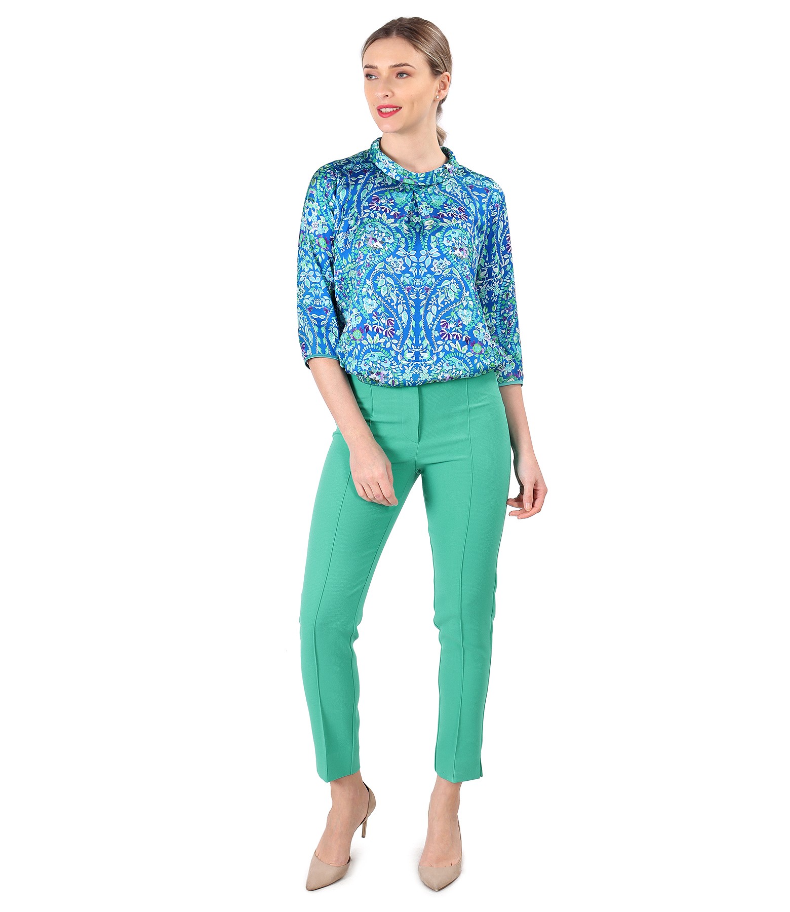 Elegant outfit with printed satin blouse and ankle pants (), size