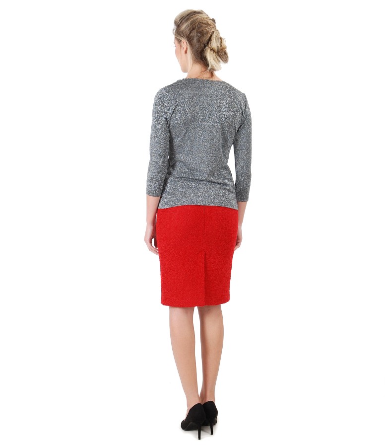 Elegant outfit with skirt made of loops and jersey blouse with folds