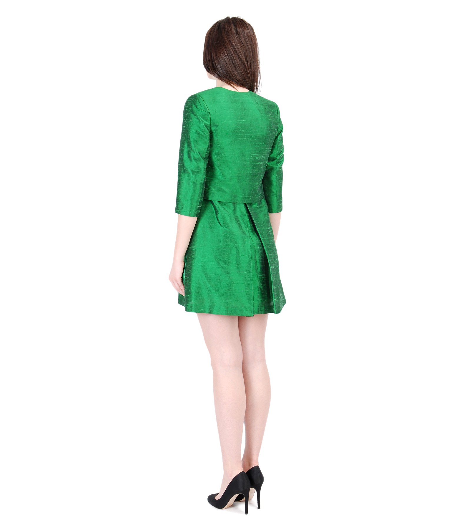 Taffeta silk short evening dress, without sleeves, with V low-cut neck. Tightens the waist with a removable belt with a staple. Closes with hidden zipper in the middle back.