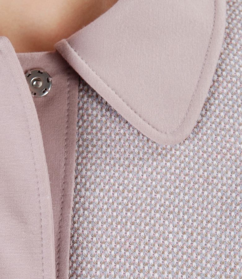 Elegant jacket with flax and viscose, with effect thread, with collar, applied flaps, trim on edge and matching thick elastic jersey termination. Closes on front with 6 hooks.