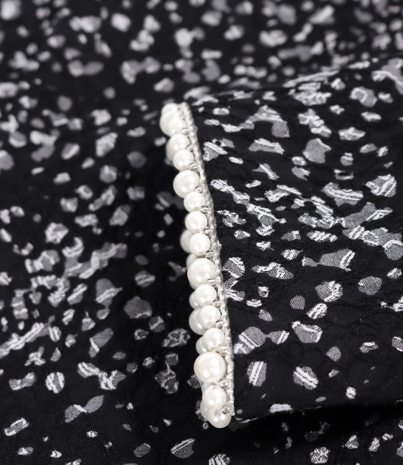 Sacou elegant din brocart elastic imprimat, necaptusit, fara guler, cu maneci 3/4 cu perle la terminatie si cu banda de rips la decolteu. Se inchide cu o capsa mos-baba pe fata.