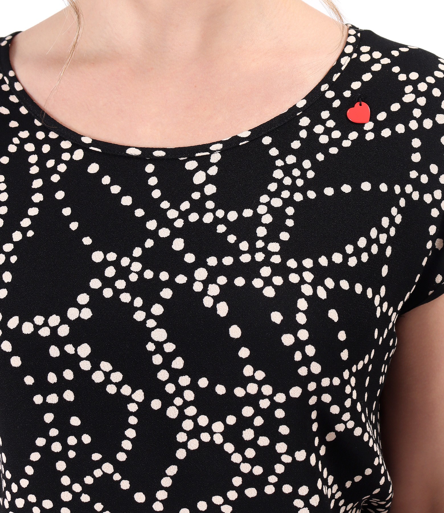 Elegant viscose blouse printed with geometric motifs, with dropped shoulders, elastic waist, and decorative metallic heart at the neckline.