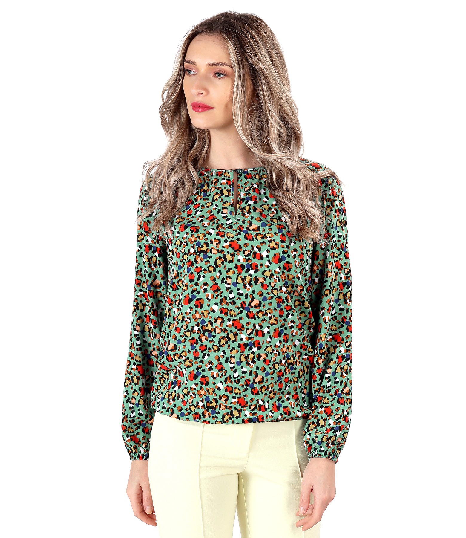 Elegant printed viscose blouse, with long sleeves with elastic, with round neckline and elastic finish at the waist. Closes with a pearl button on the middle of the face.