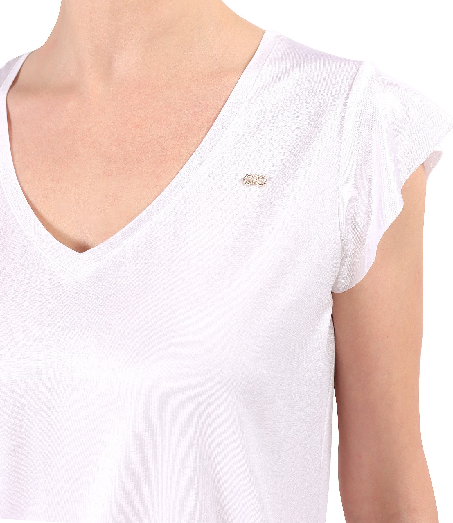 Elegant satin elastic jersey blouse, short sleeves, V-neck, and elastic at the waist.