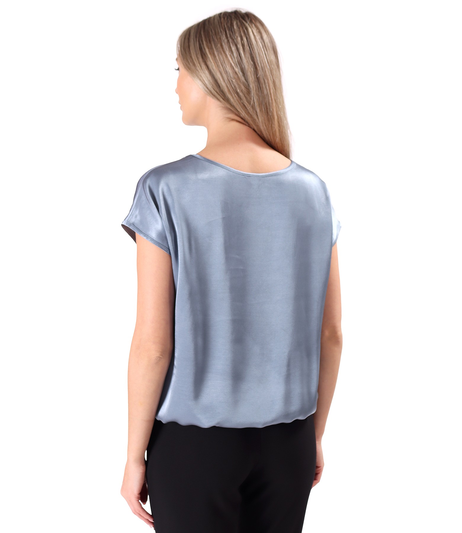 Elegant satined viscose blouse, with dropped shoulders and elastic at the waist.