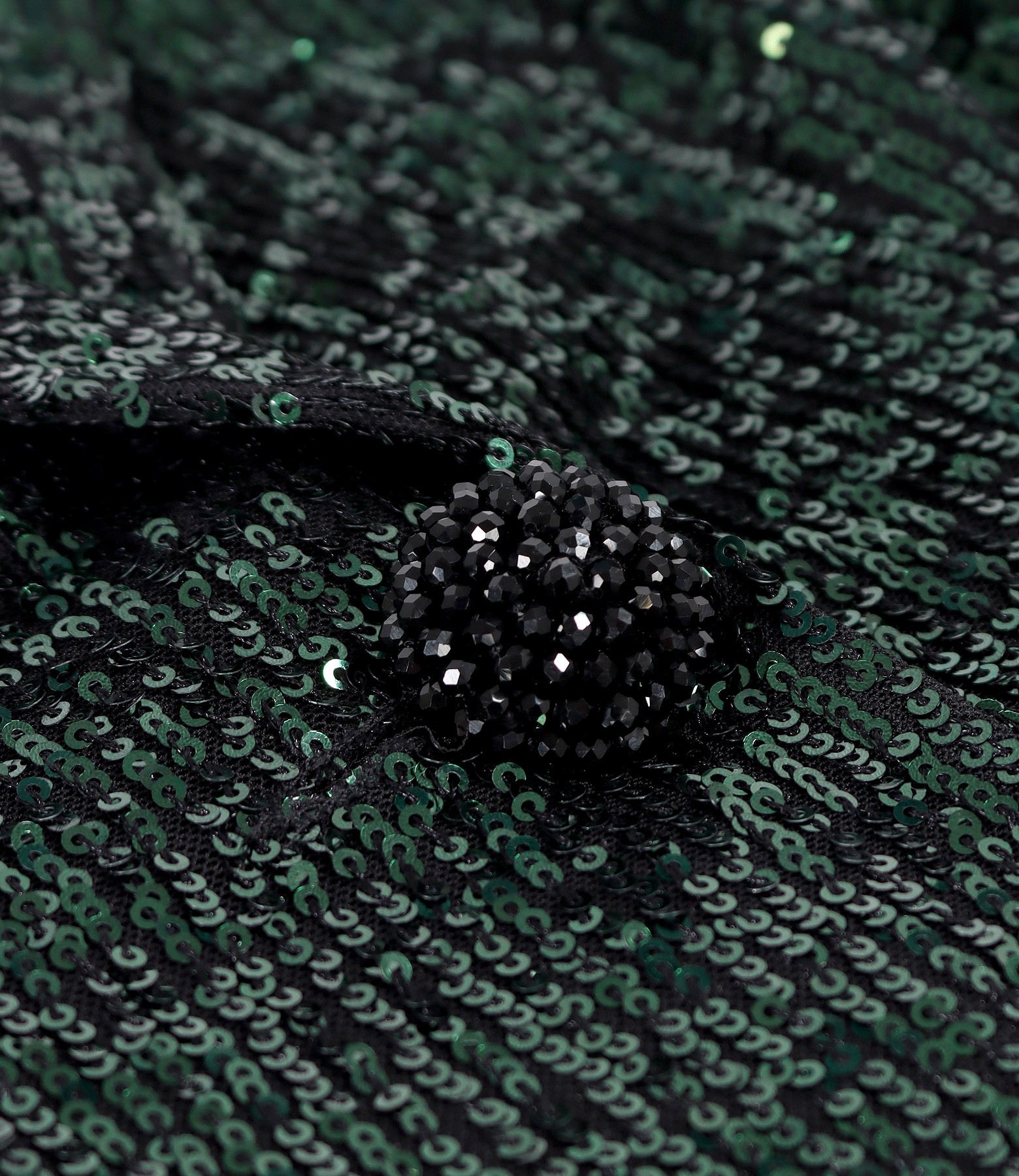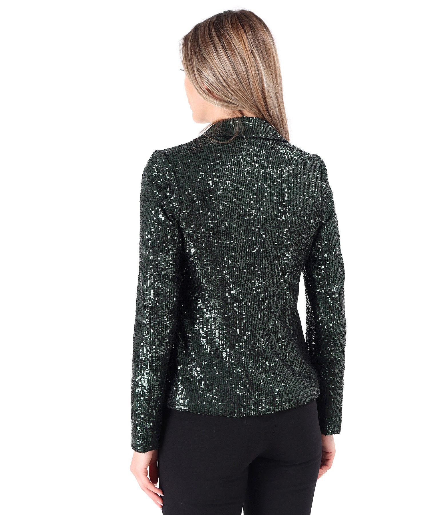 Elegant sequin jacket, padded with satin, with deep neckline. It closes with a button on the face.