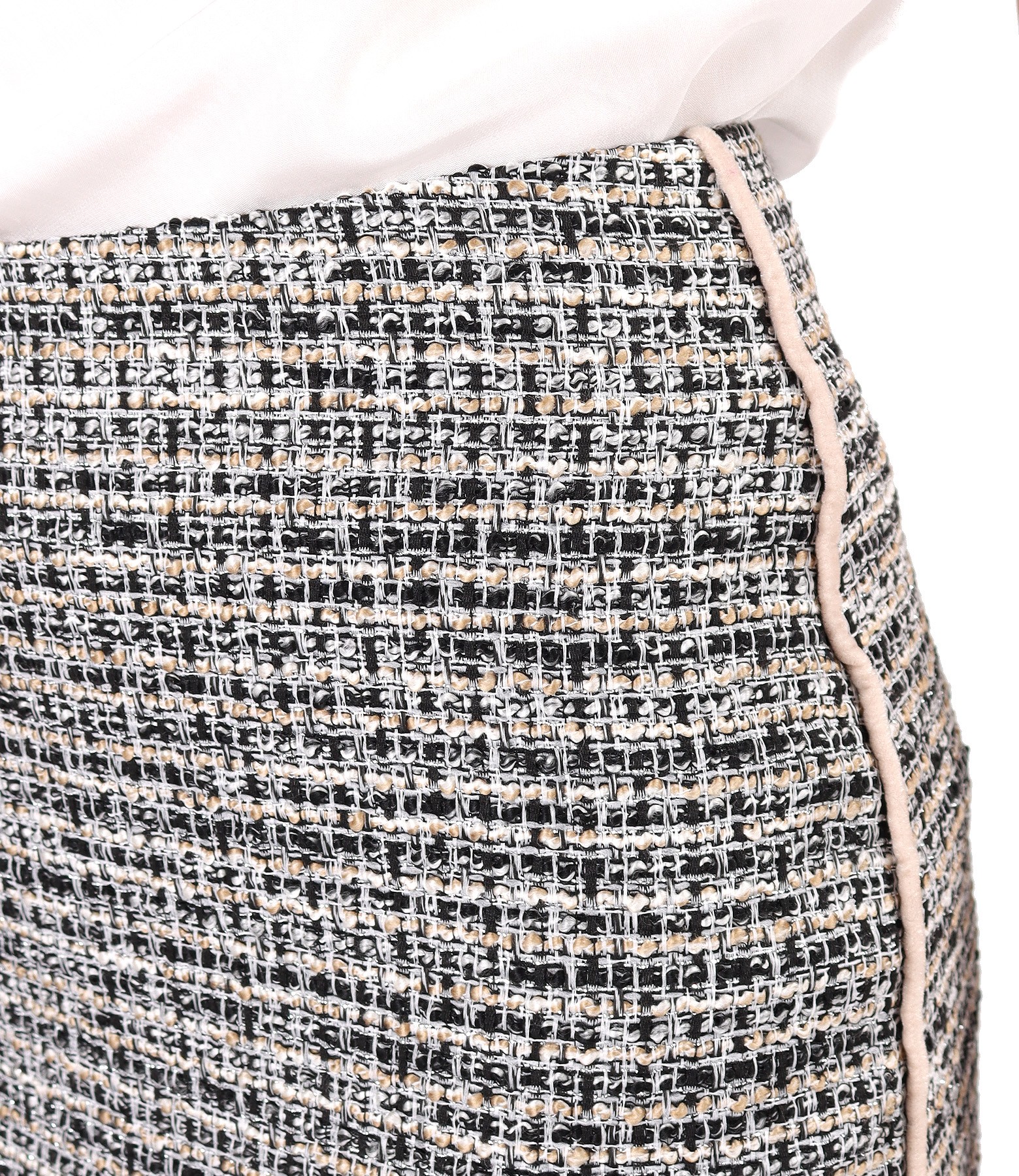 Elegant skirt made of curls with viscose and metallic thread, padded, with velvet trim on the side and with a slit on the middle of the back. It closes with a hidden zipper in the middle of the back.