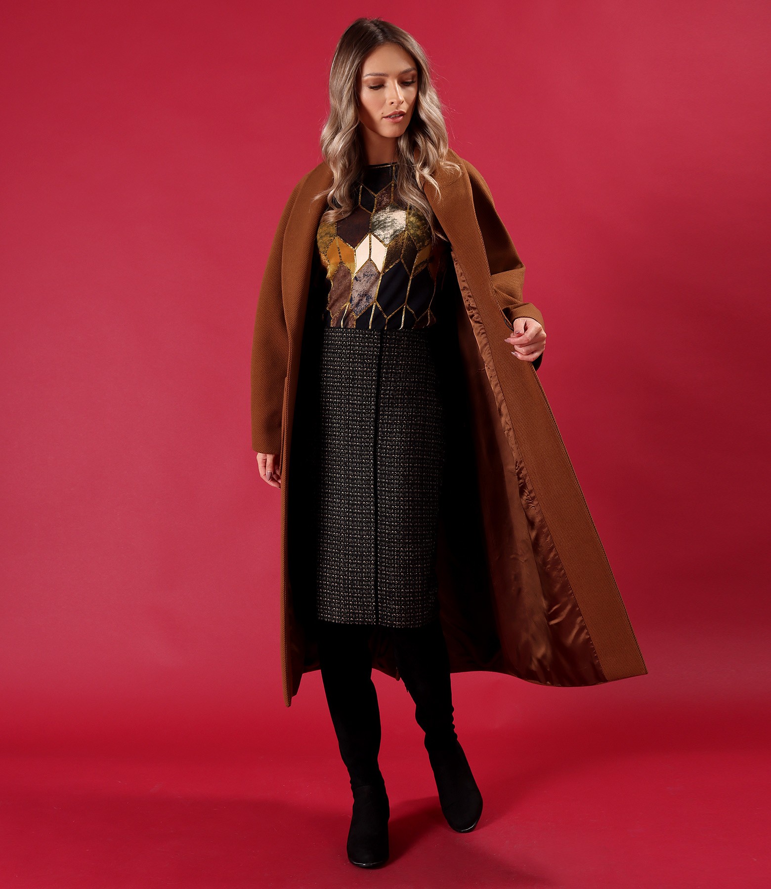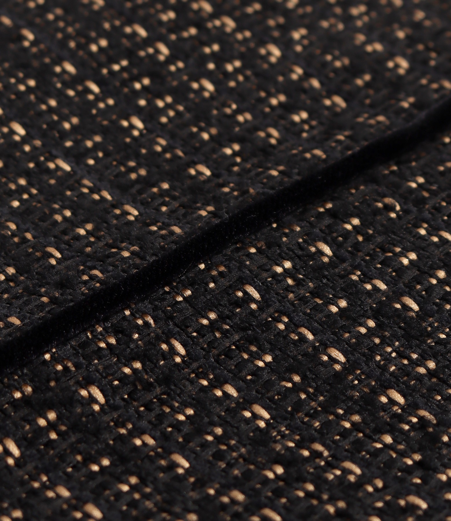 Elegant skirt made of loops, lined, with velvet trim on the front and slit on the middle back. It closes with a hidden zipper in the middle of the back.