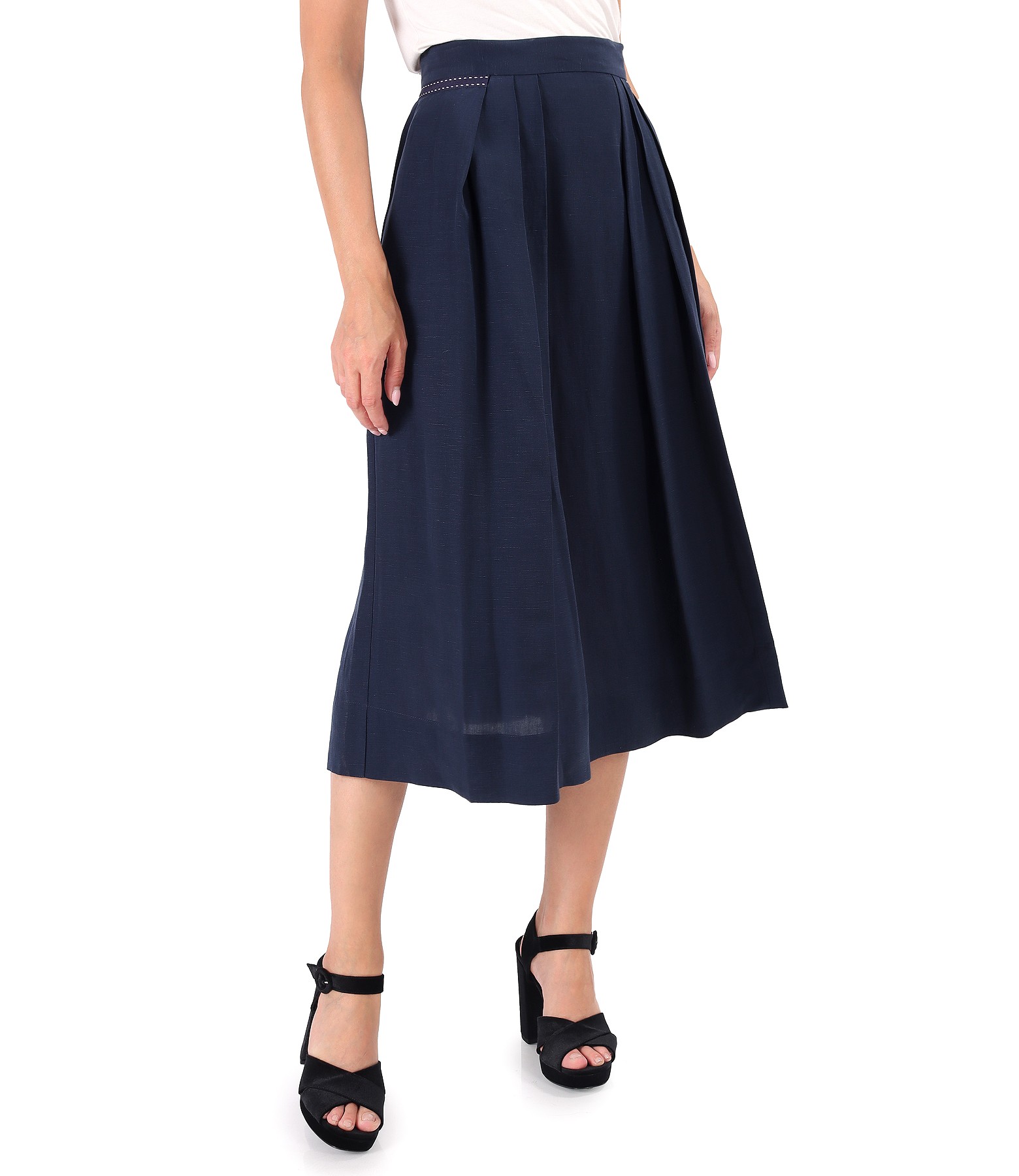 Elegant skirt made of tencel with linen, unlined, with pleats on the front and back, with a wide drawstring at the waist with a rips band with contrasting decorative stitching and side pockets. Closes with a hidden zipper on the middle back.