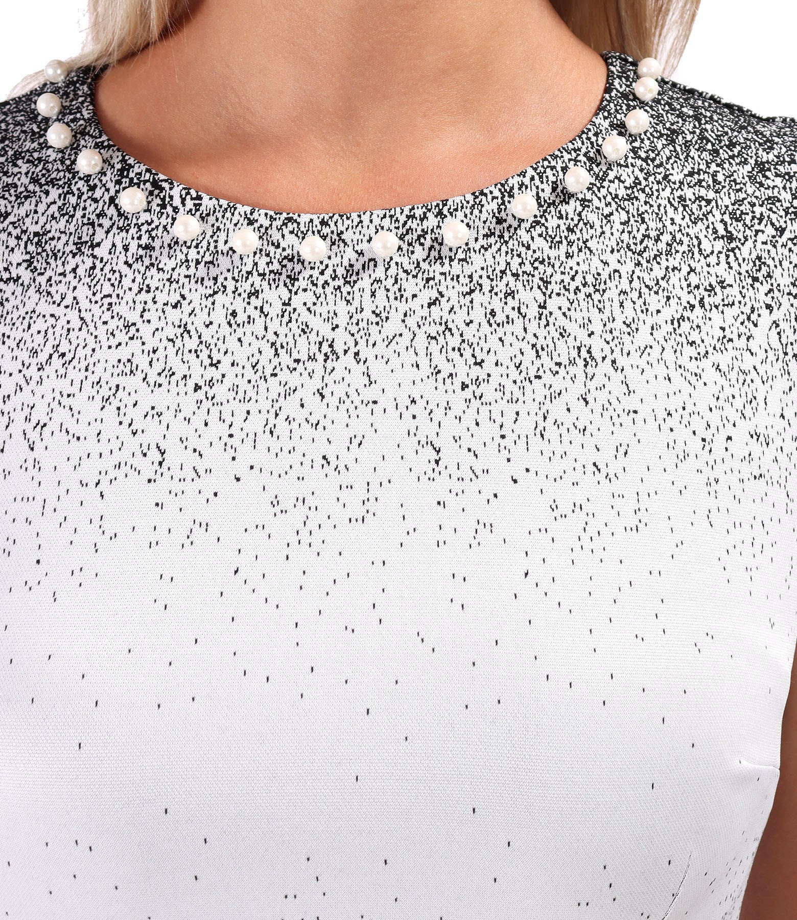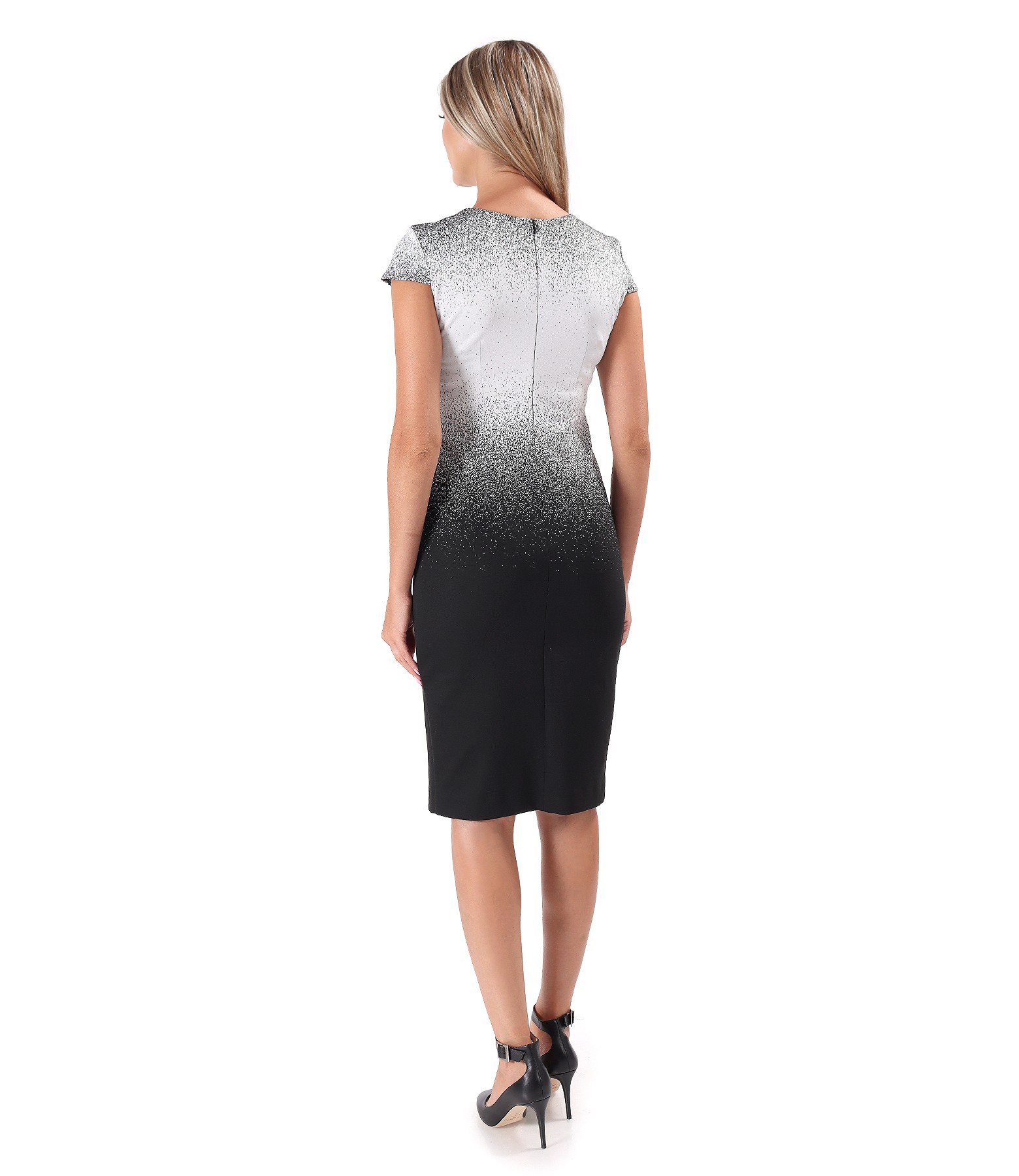 Elegant dress made from full, elastic jersey with a gradient print, featuring a round neckline adorned with hand-sewn pearls and short flutter sleeves. It fastens with a concealed zipper at the center back.
