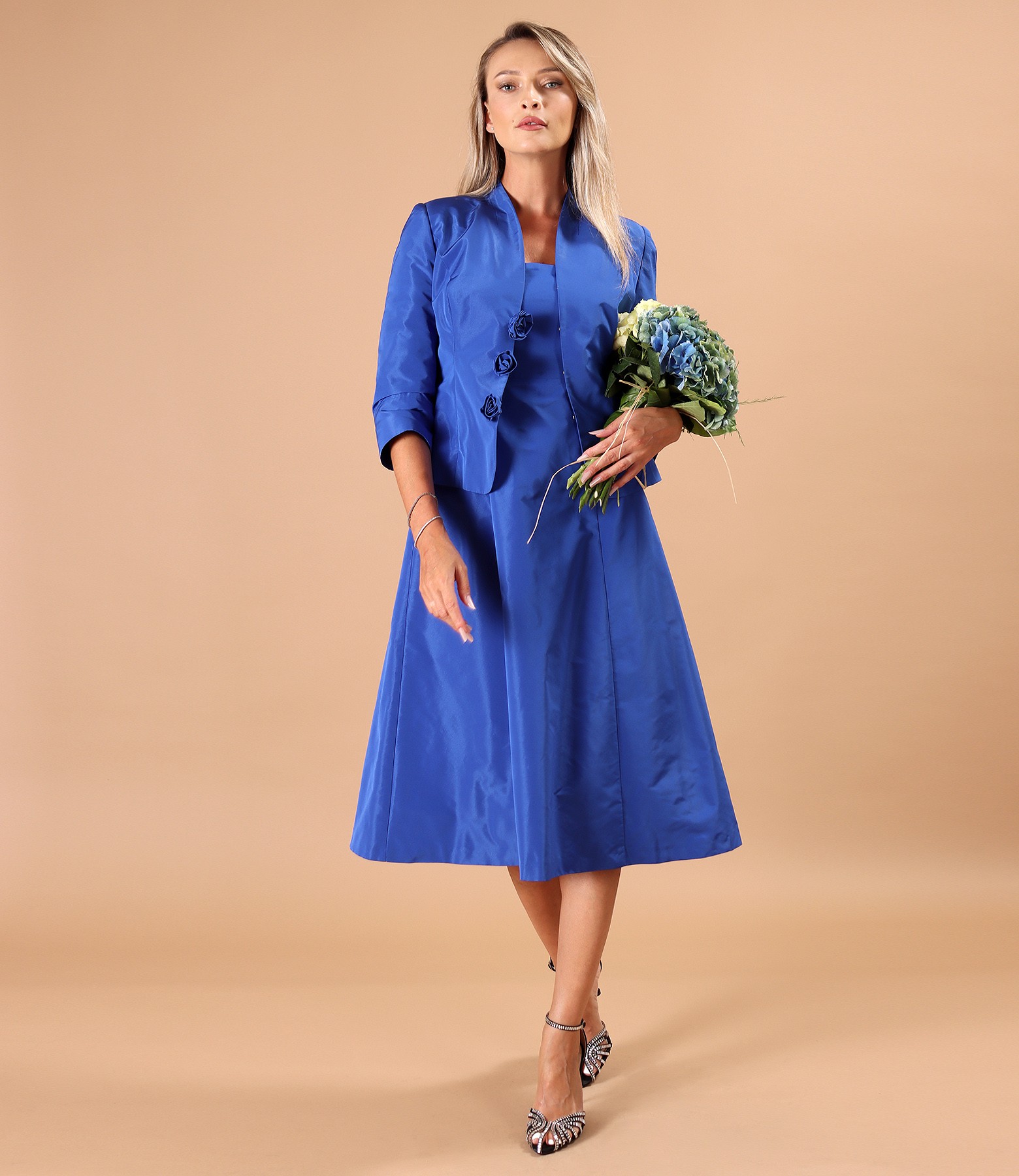 Elegant taffeta jacket with a matte effect, 3/4 sleeves, tunic-like collar, and deep neckline. The jacket has decorative handmade flowers sewn on the middle of the front. It fastens with three snap buttons at the front.