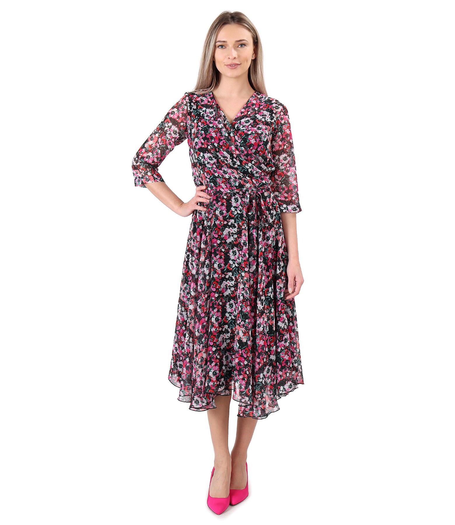 Elegant veil dress printed with floral motifs, padded with viscose, with 3/4 sleeves, party breasts, and drawstring at the waist. It closes with a zipper hidden in the middle of the back.