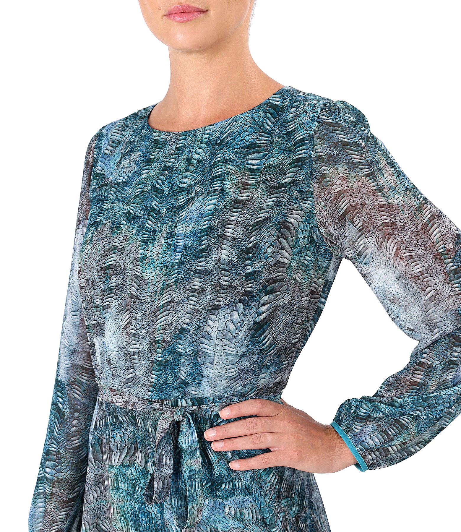 Elegant veil dress, doubled with viscose, with long sleeves wrinkled at the end, round neckline and waist cord. Closes with a hidden zipper on the middle back.
