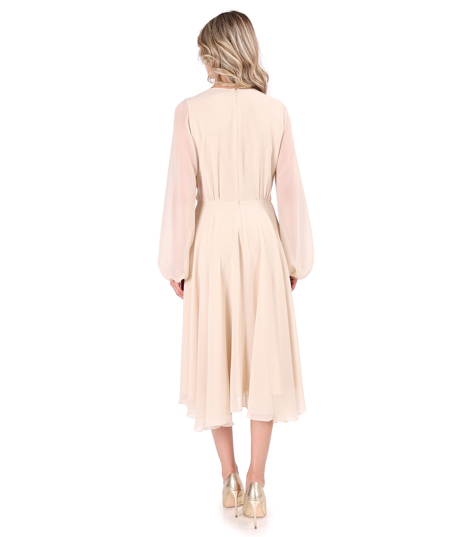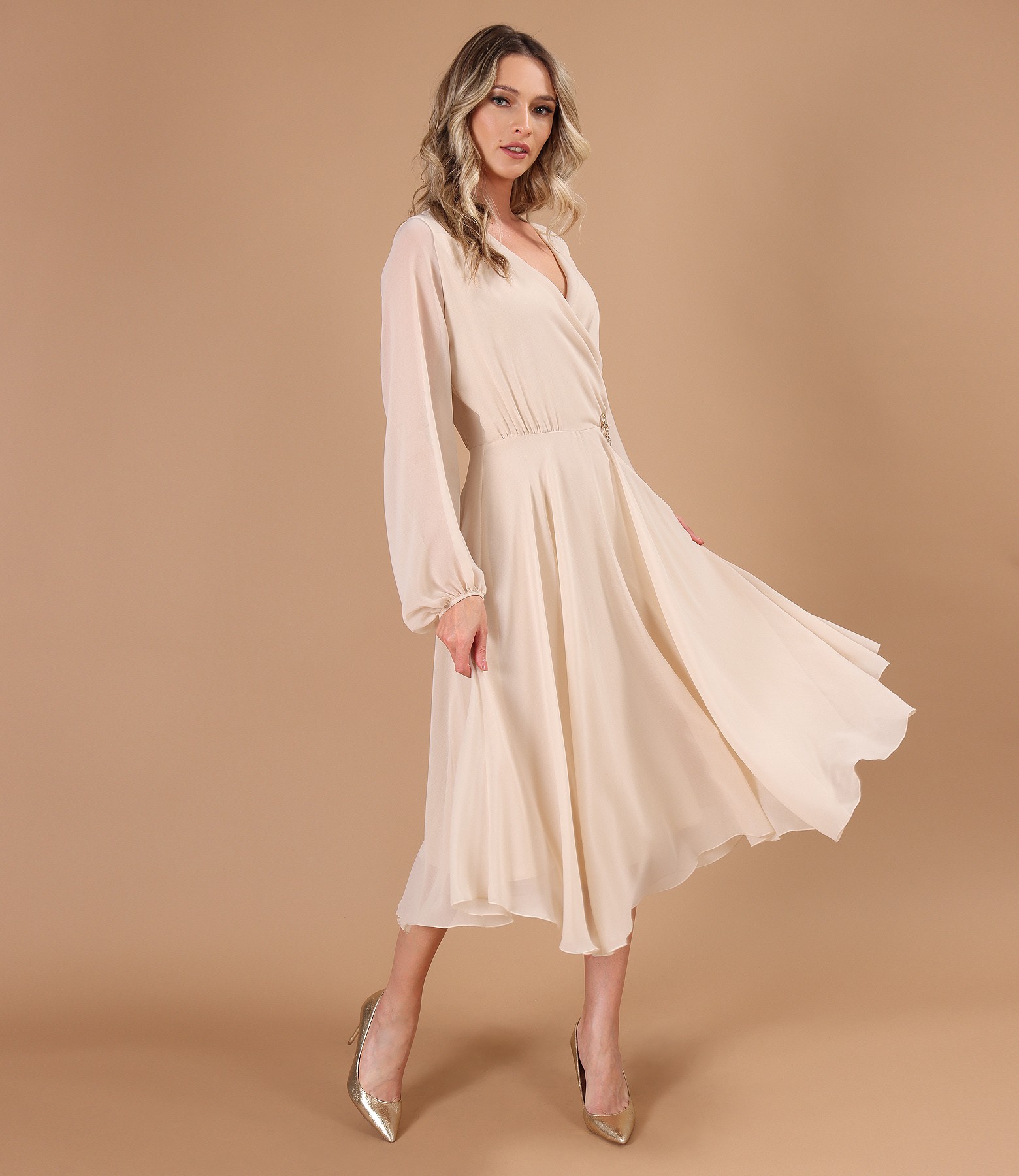 Elegant veil dress with a golden brooch at the waist (Beige), size