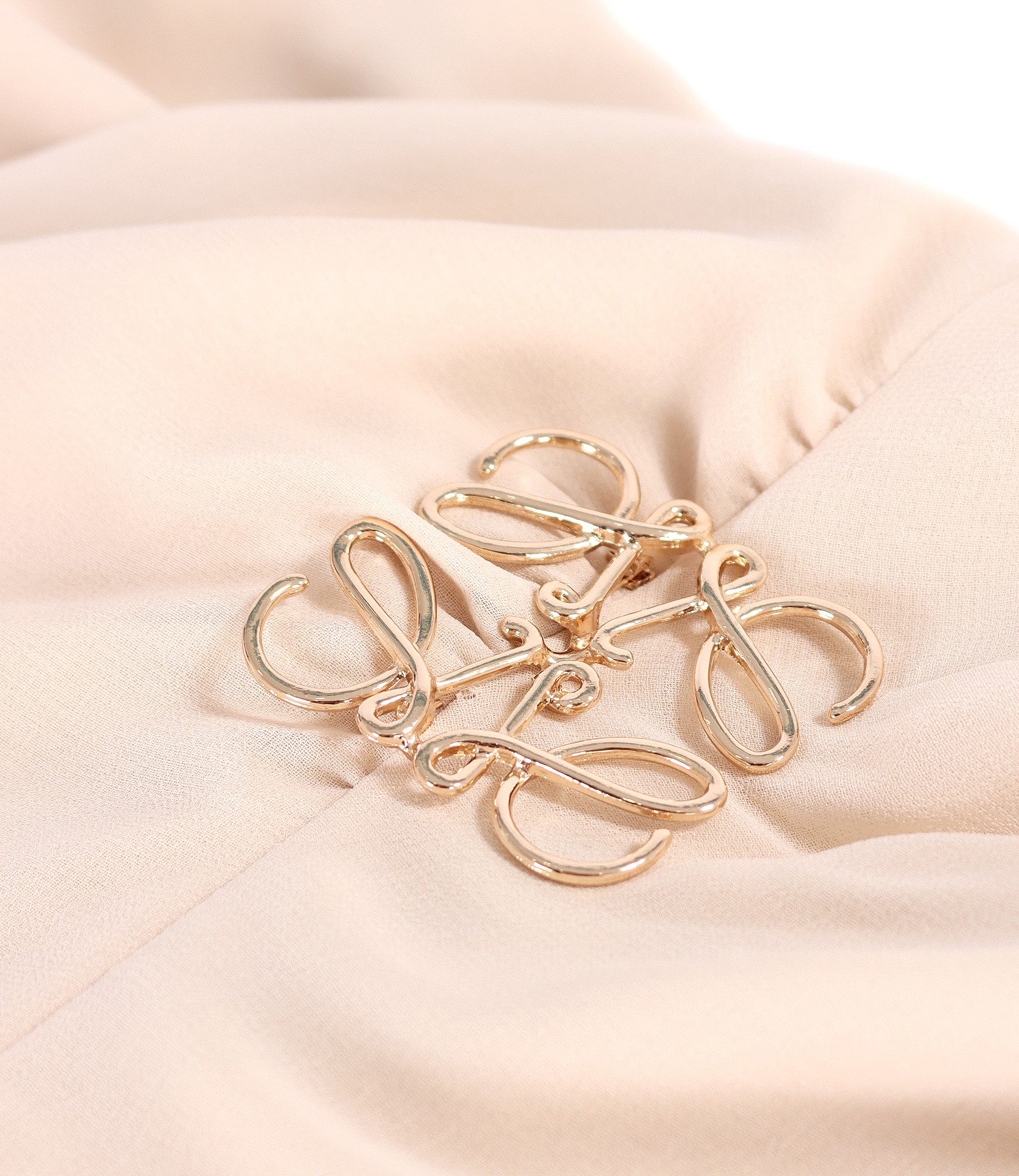 Elegant dress made of veil with a removable golden brooch at the waist, padded with viscose, long fluid flared sleeves, fastened at the waist. It closes with a hidden zipper in the middle of the back.
