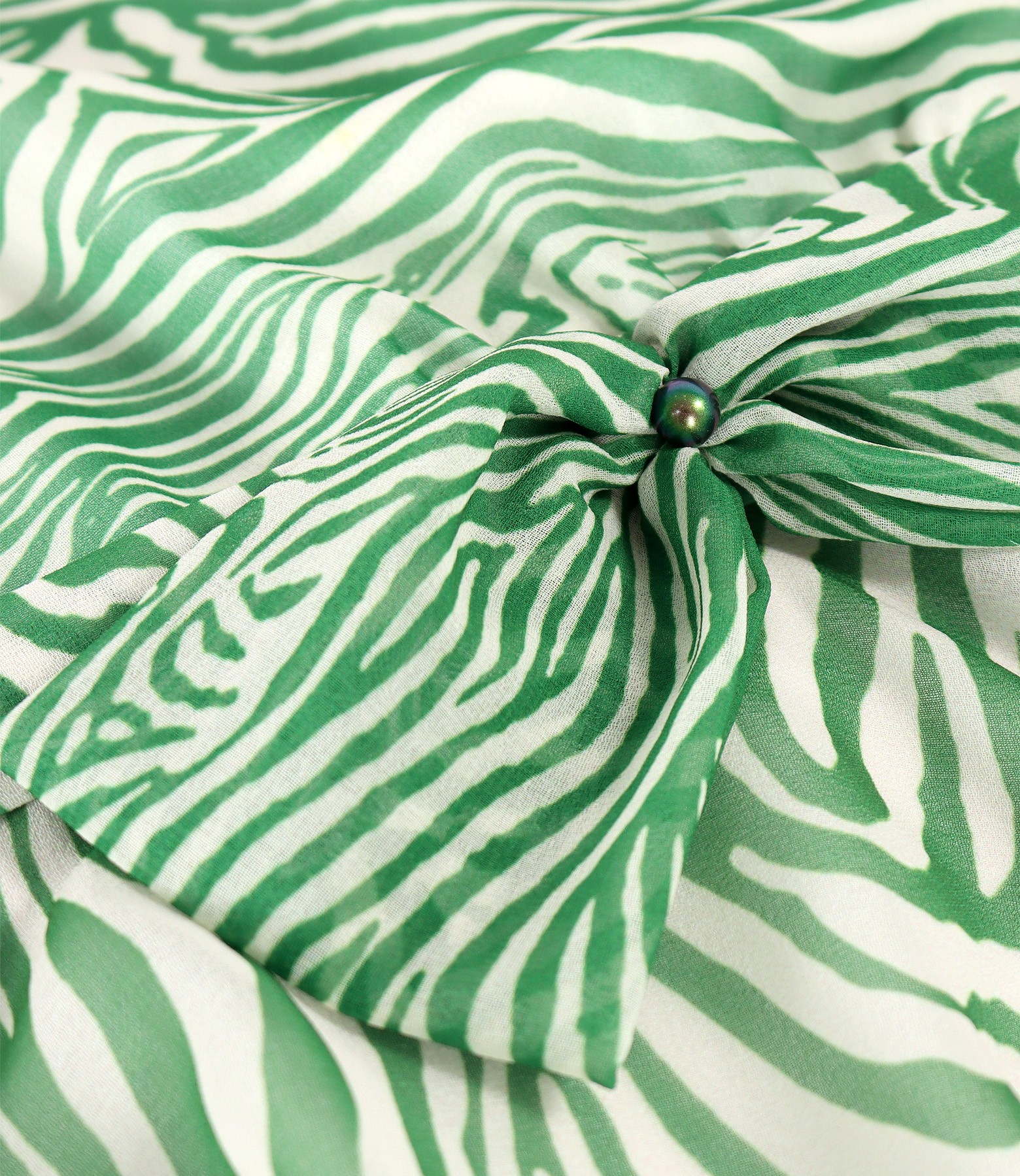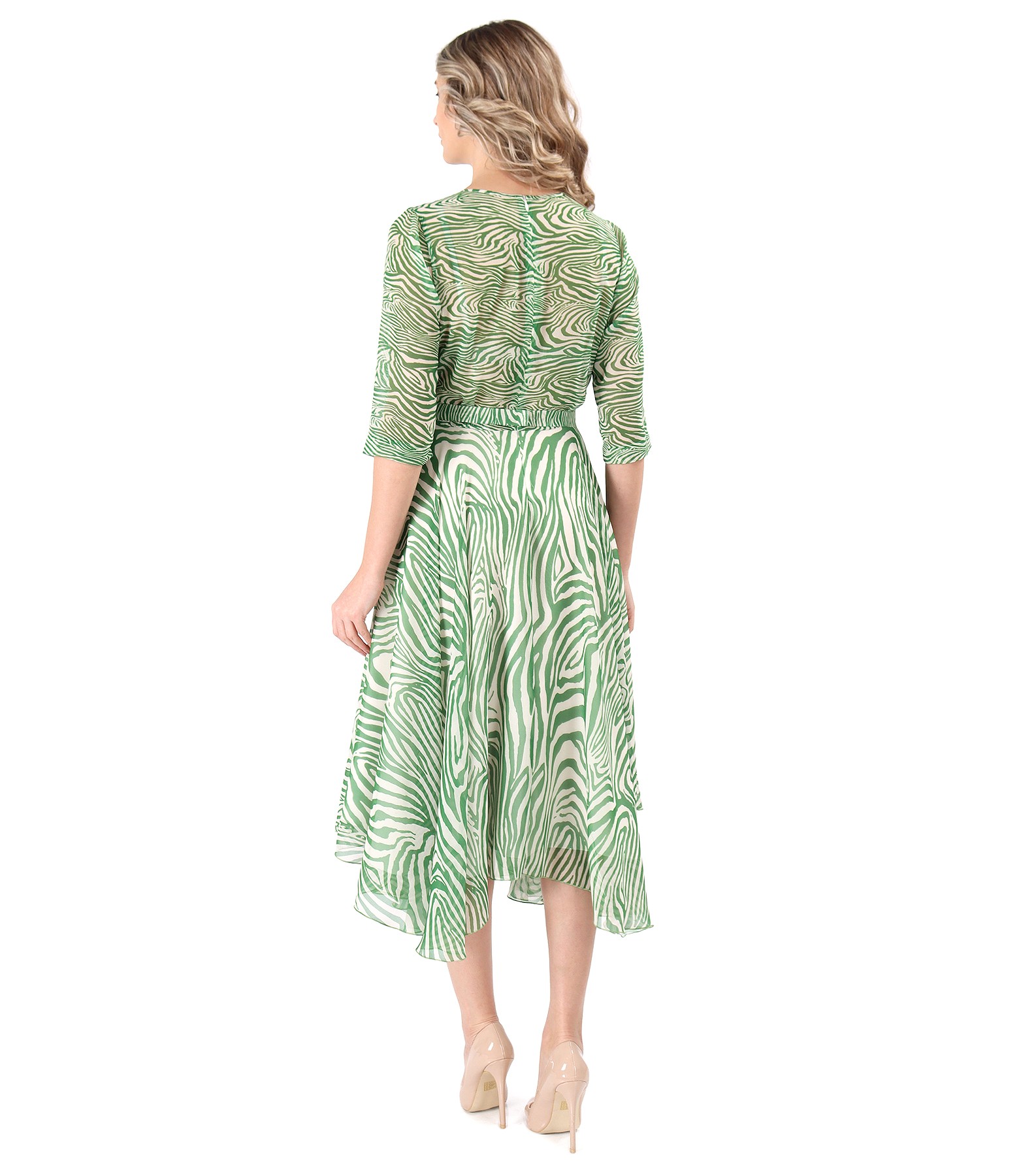 Elegant dress in digitally printed veil with geometric motifs, padded with viscose and 3/4 sleeves. It closes with a hidden zipper on the middle back. It is tightened with a drawstring with a veil bow at the waist.