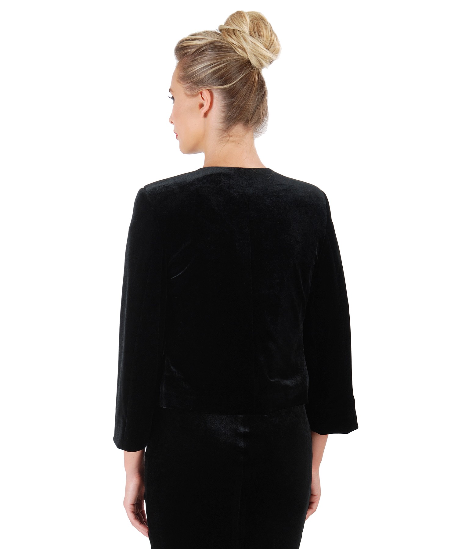 Elastic velvet bolero, lined, with 3/4 sleeves, embellished with crystals on the low-cut neck. Closes with 2 staples.