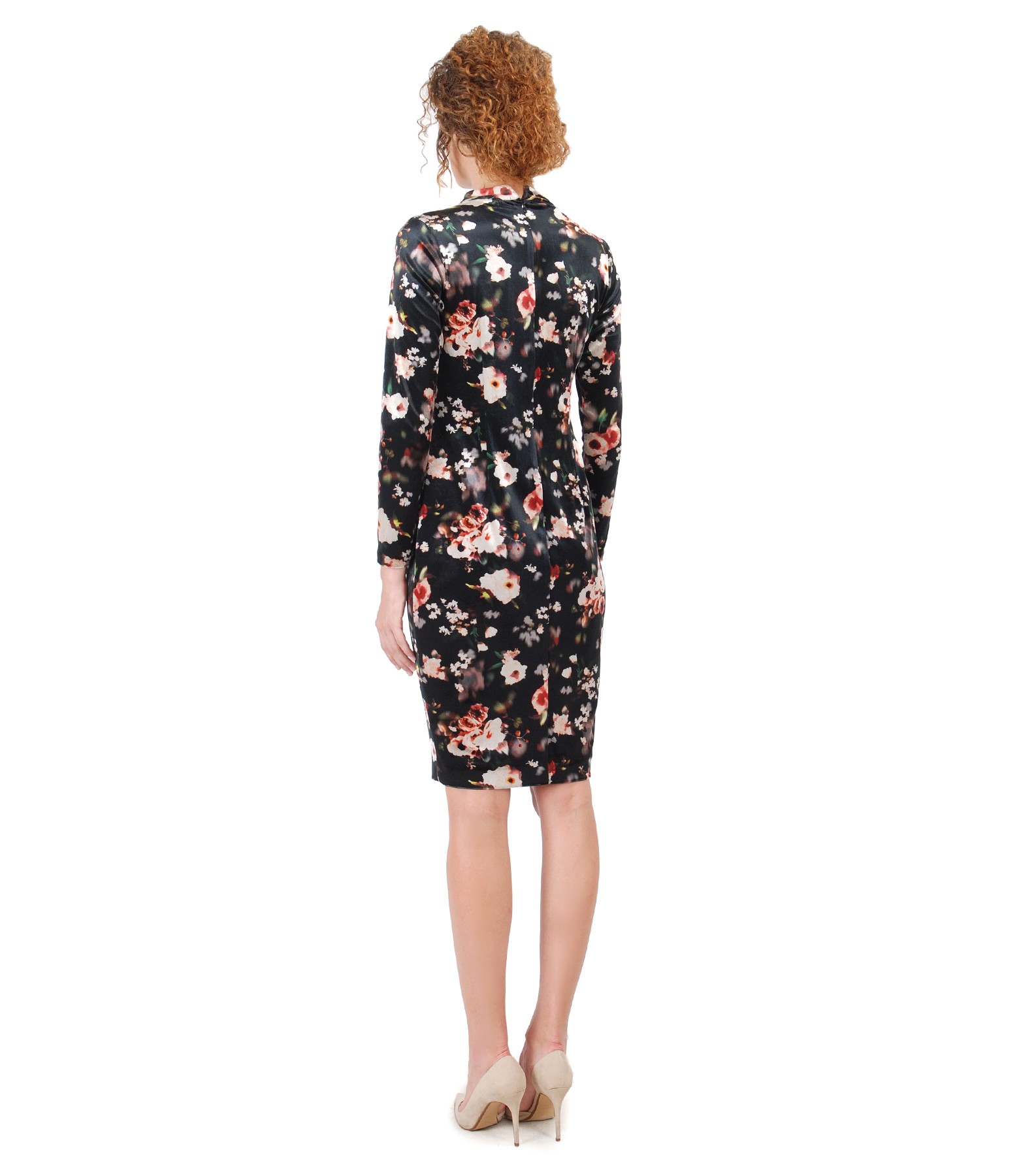 Elegant dress made of elastic velvet, with floral print, unlied, with tunic collar and long sleeves. Closes with hidden zipper on the middle back.