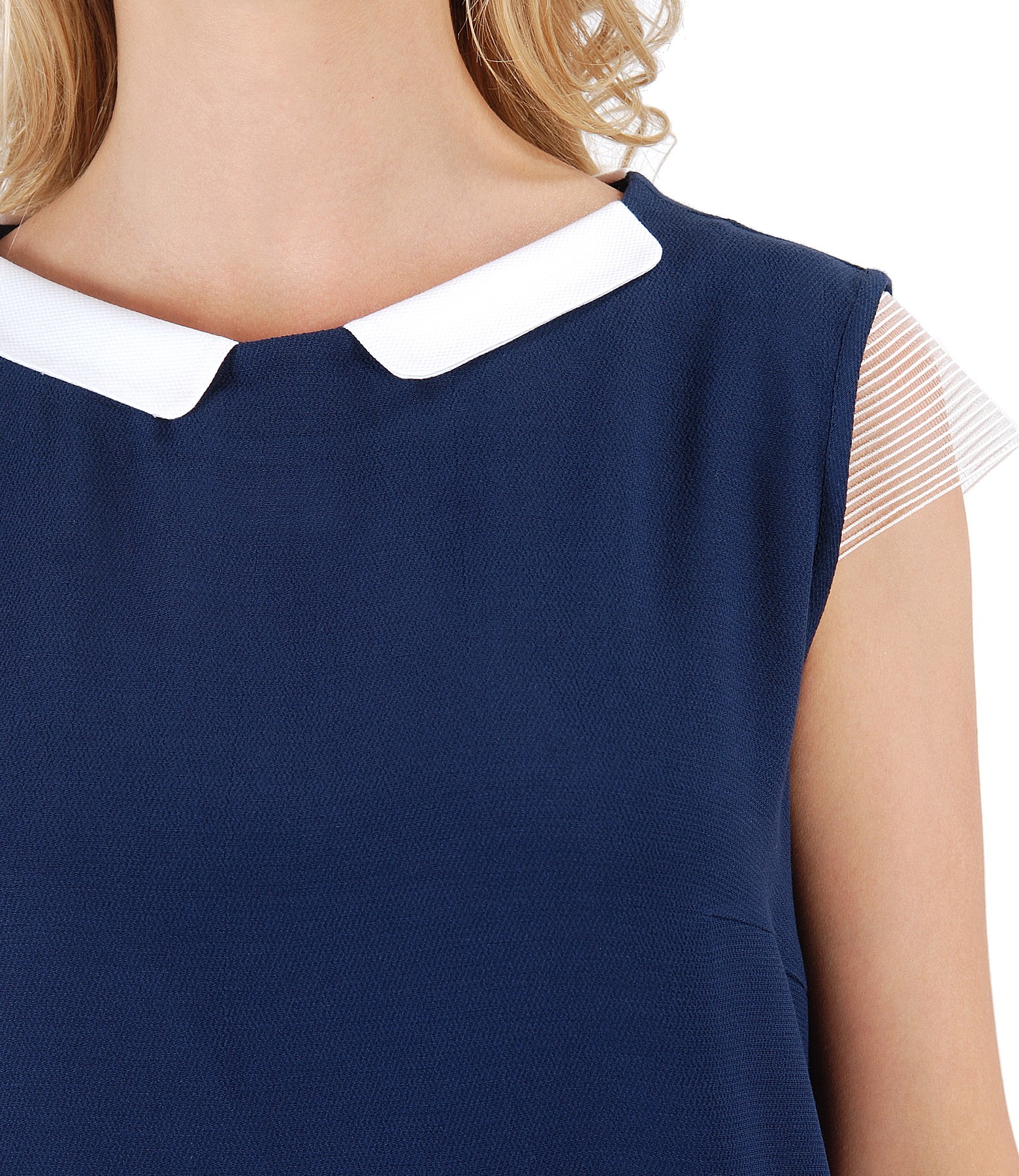 Elegant viscose blouse, with short elastic sleeve and two, front and back, collars. Closes with hidden zipper on the middle back.