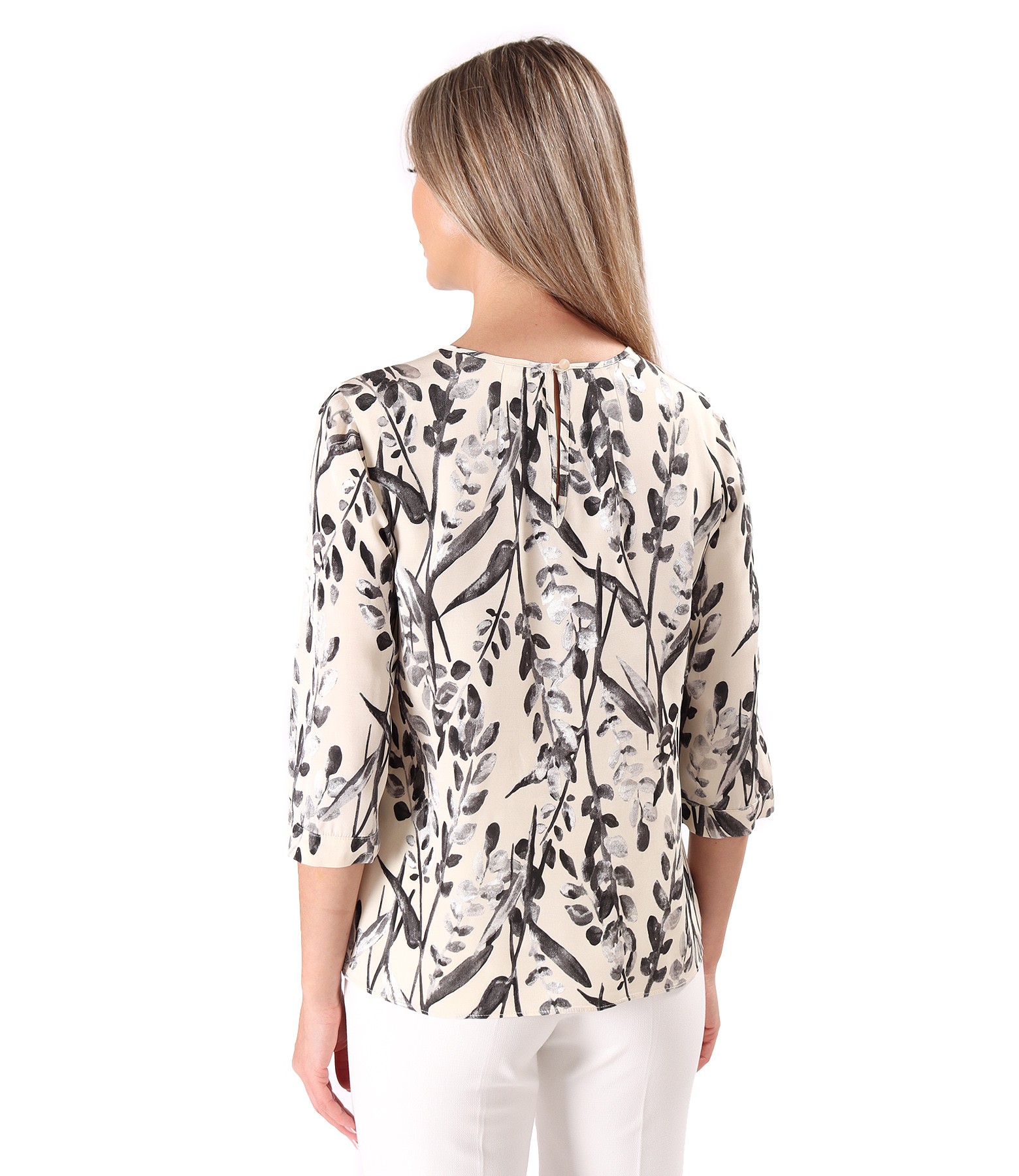 Elegant blouse in viscose printed with floral motifs, with 3/4 sleeves and a round neckline. The blouse closes with a button at the center back.