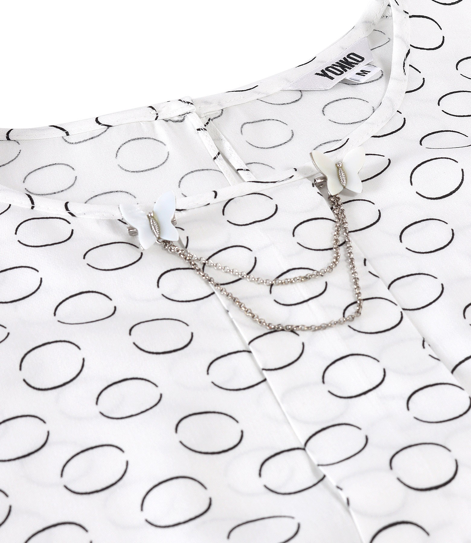 Elegant viscose blouse printed with circles, with short sleeves, round neckline and butterfly brooch, It closes with a button on the middle back.