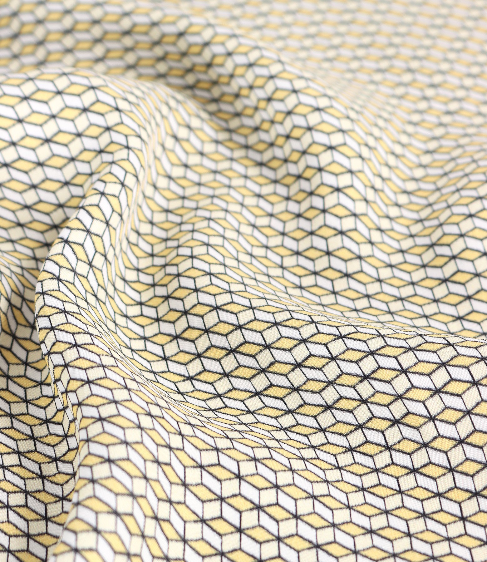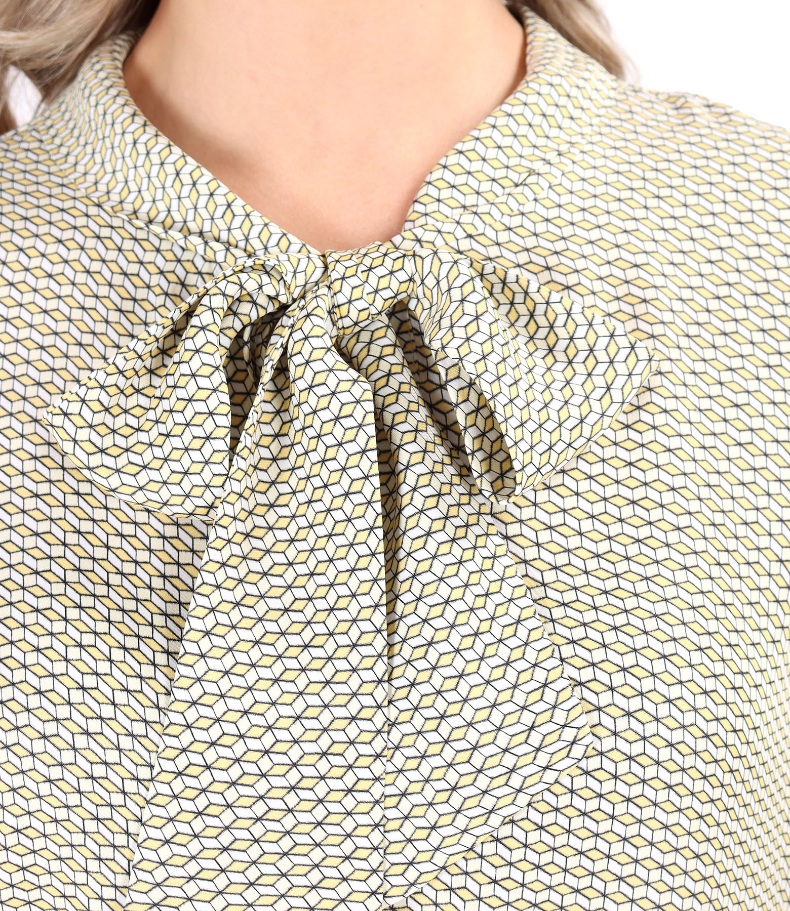 Elegant viscose blouse printed digitally with geometric motifs, with a scarf-like collar and short sleeves.