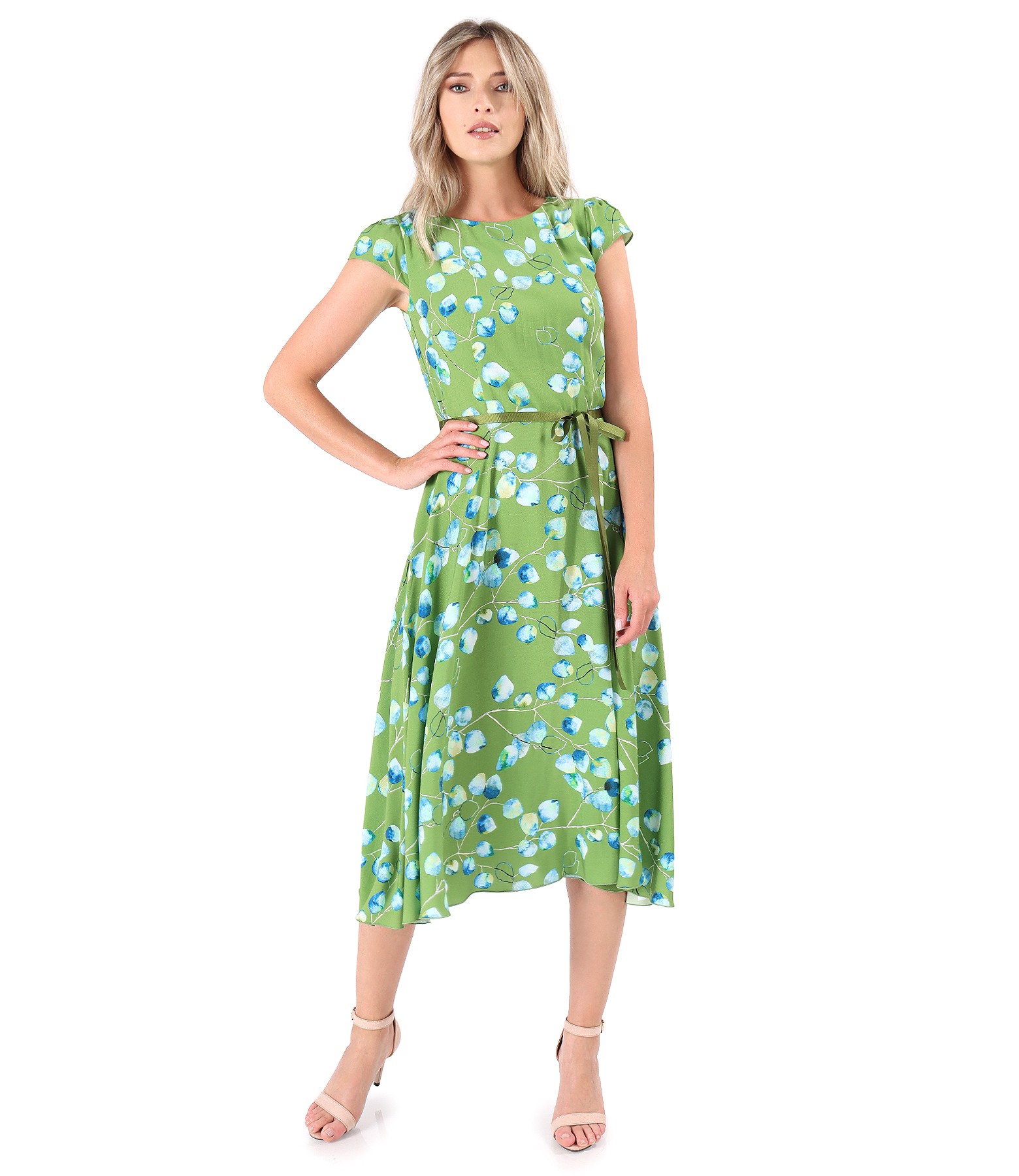 Elegant viscose dress printed with floral motifs, doubled at the top with viscose, with short sleeves, round neckline, and rips at the waist. It closes with a hidden zipper on the middle back.