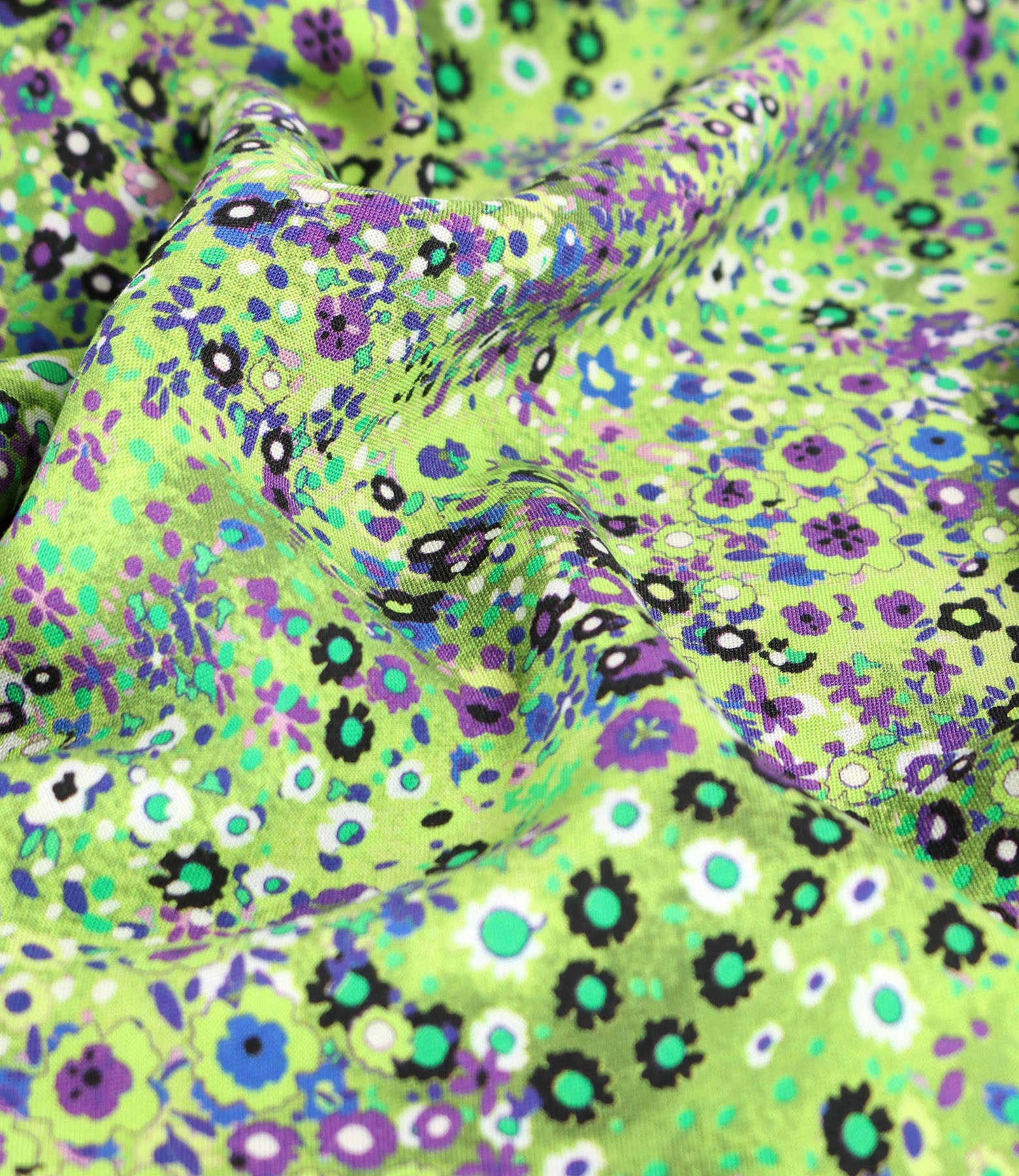 Elegant viscose dress printed with floral motifs, doubled at the top with viscose, with short sleeves, round neckline, and rips at the waist. It closes with a hidden zipper on the middle back.