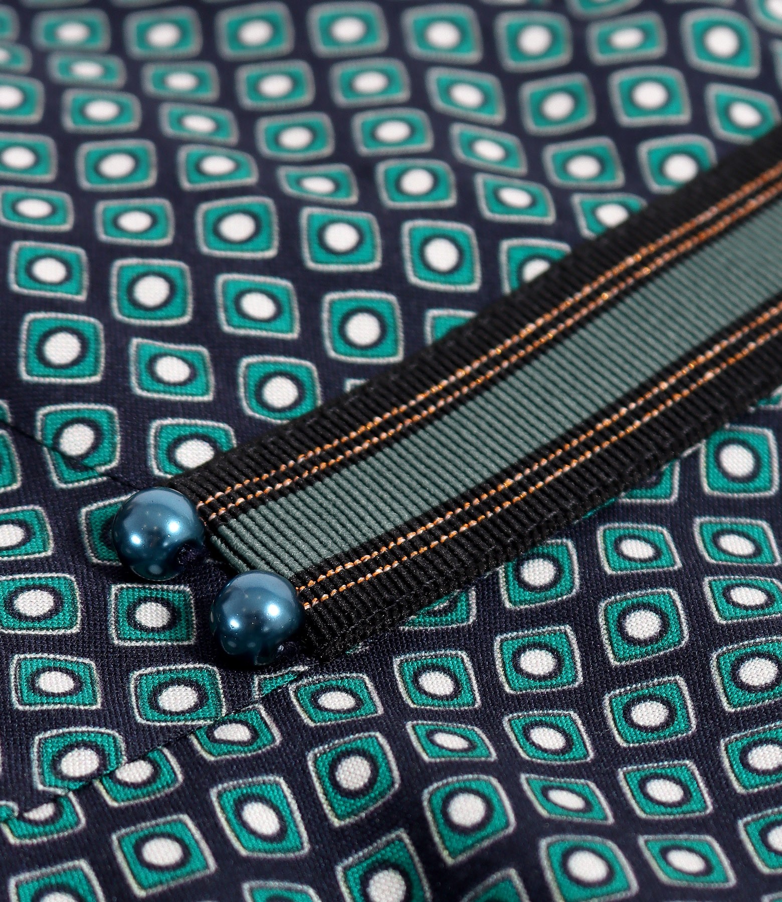 Elegant viscose dress printed with geometric motifs, doubled with viscose at the top, with 3/4 sleeves, and with a decorative band at the waist. It closes with a hidden zipper in the middle of the back.