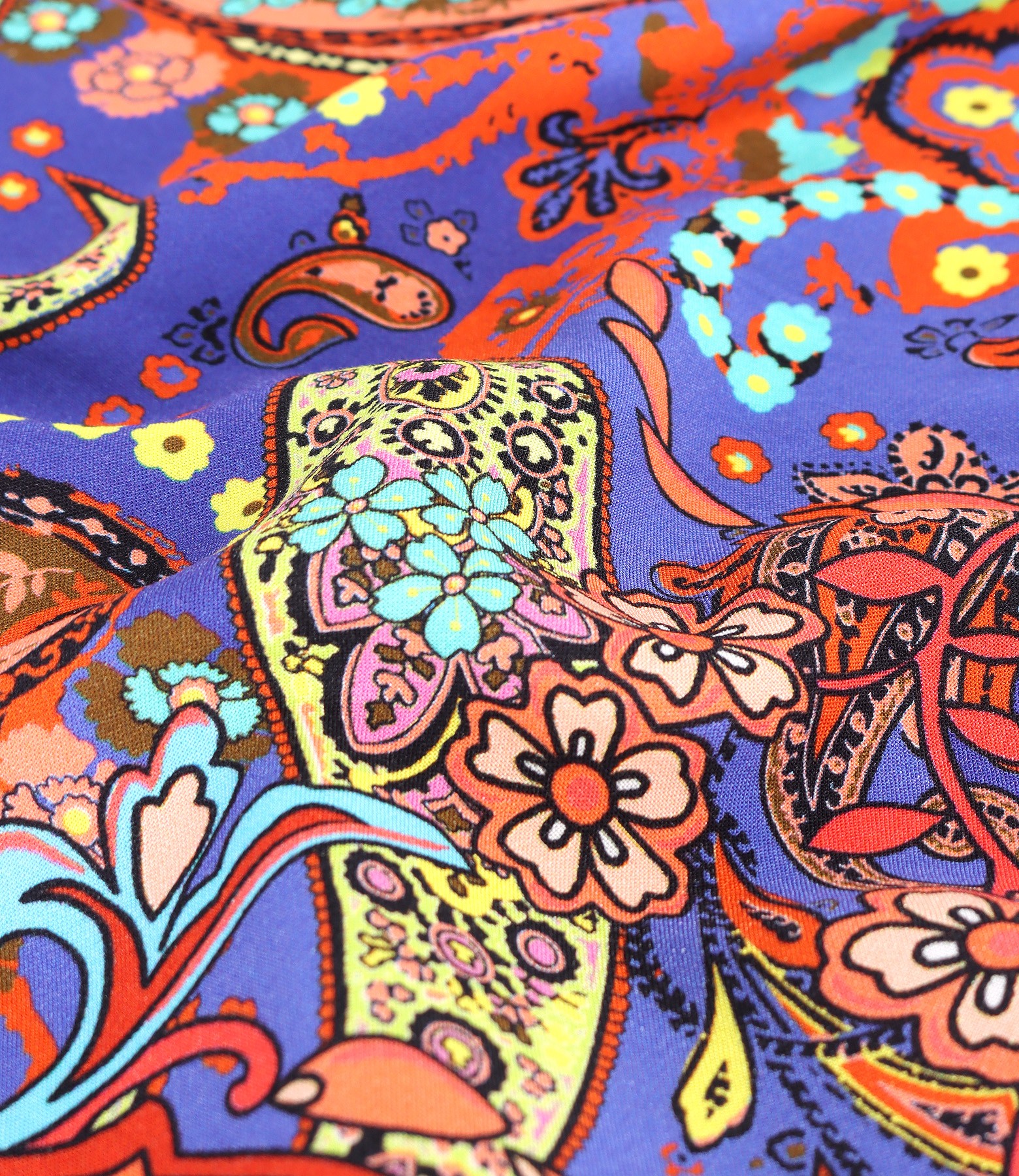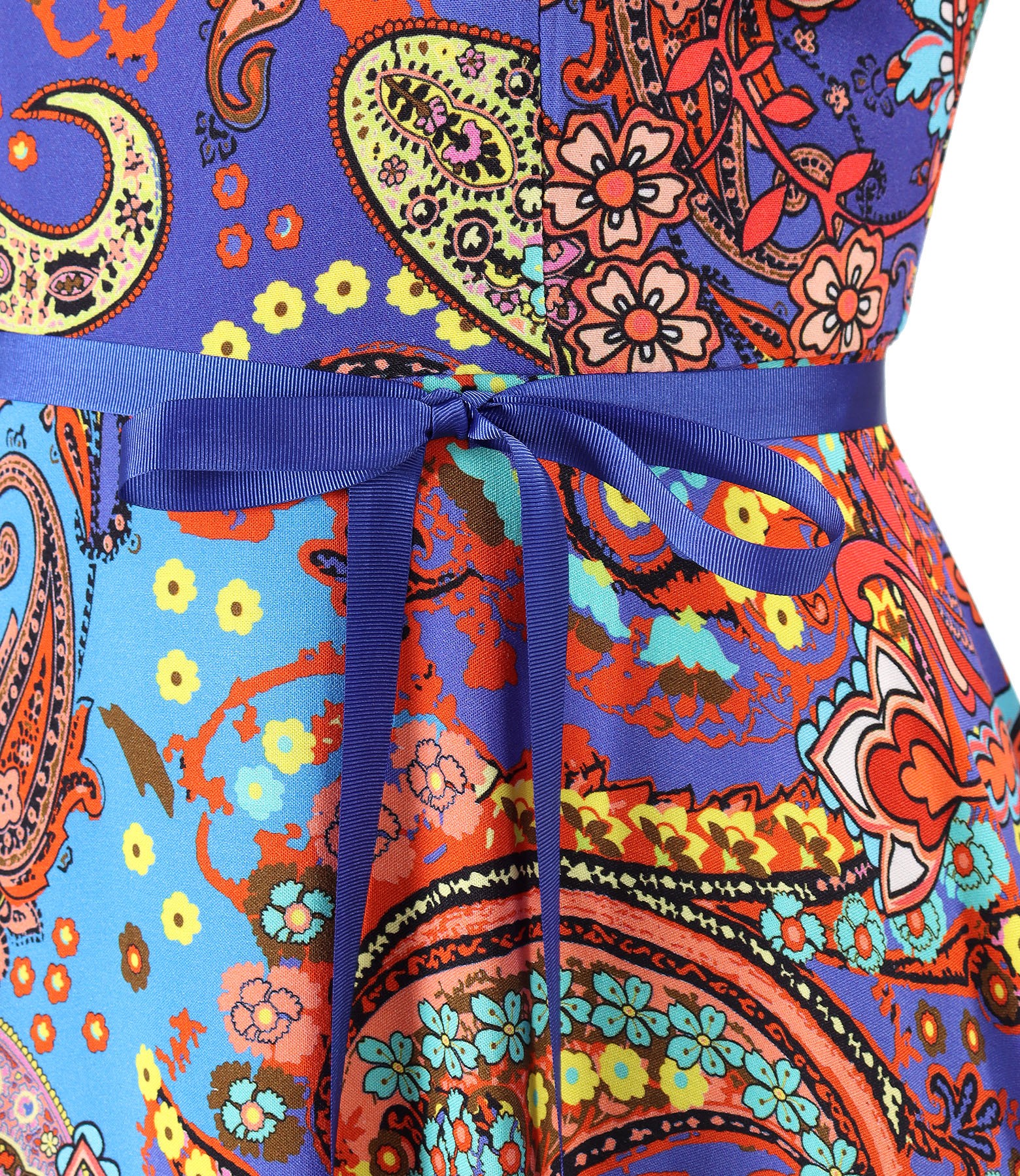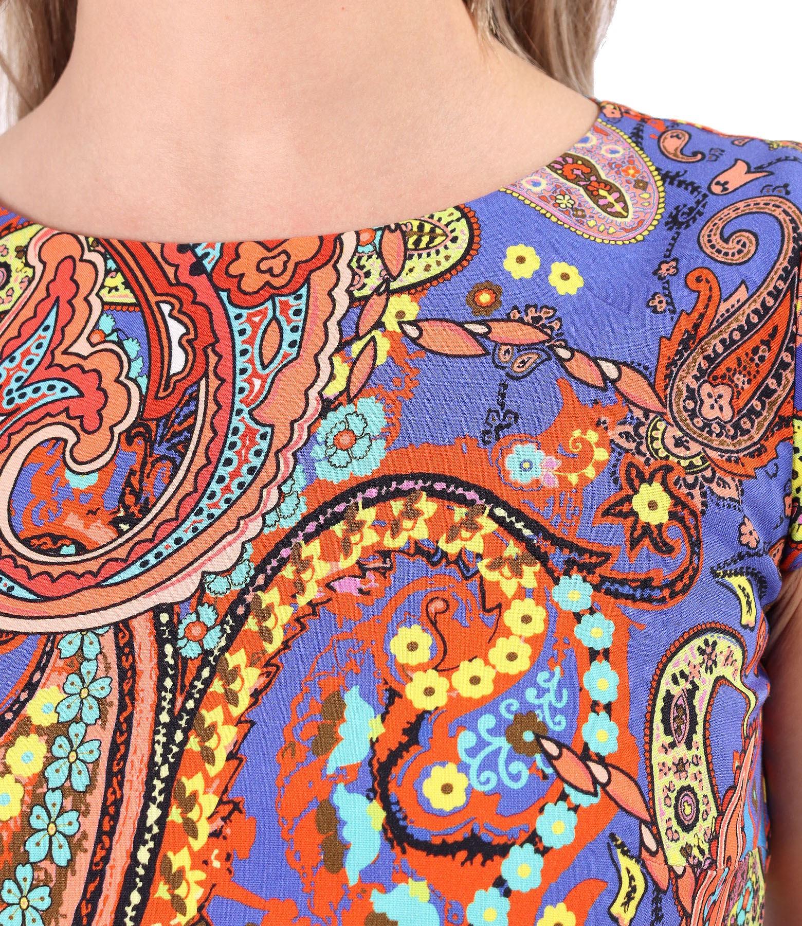 Elegant viscose dress printed with paisley motifs, lined at the top with viscose, with short sleeves, round neckline, and drawstring at the waist. It closes with a hidden zipper on the middle back.