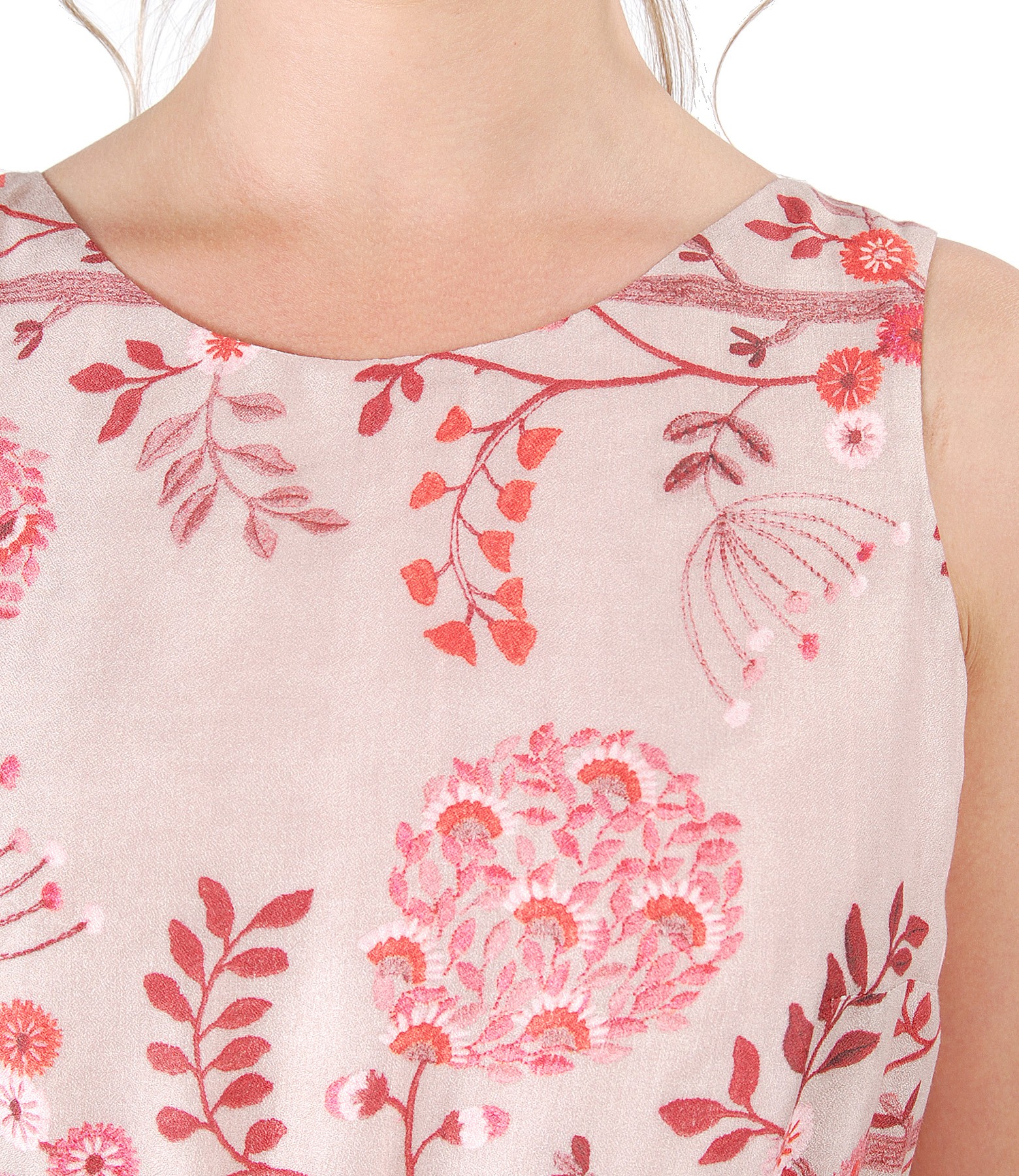 Elegant viscose dress with floral print, doubled with viscose, with round low-cut neck, side pockets and elastic waist.