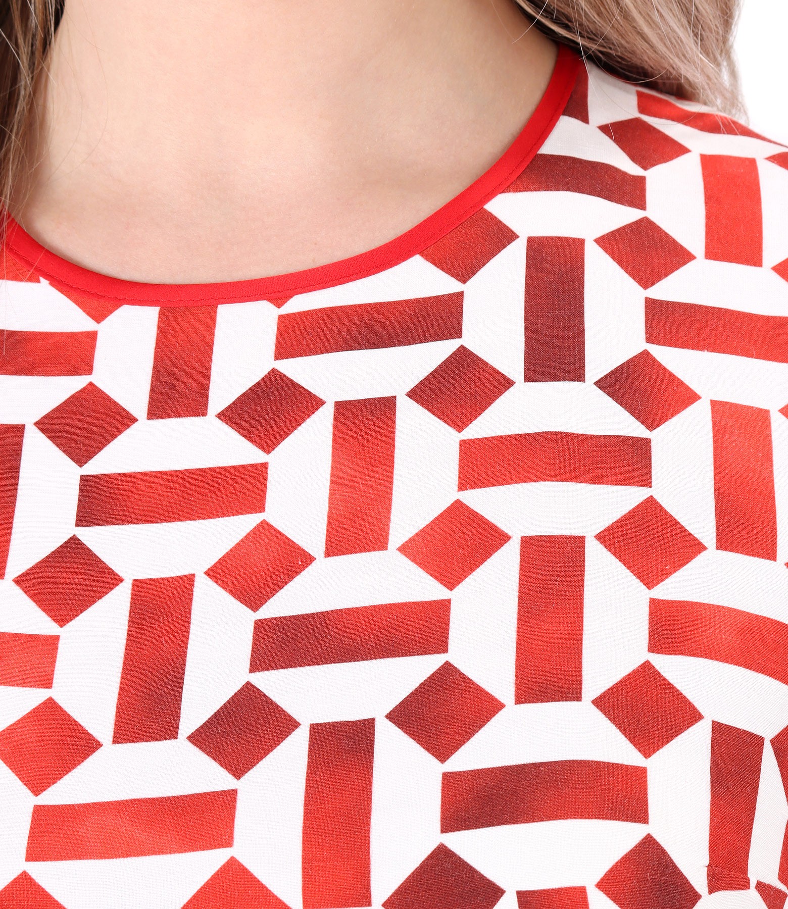 Elegant viscose linen dress, digitally printed with geometric motifs, unlined, with round decolletage and short sleeves.