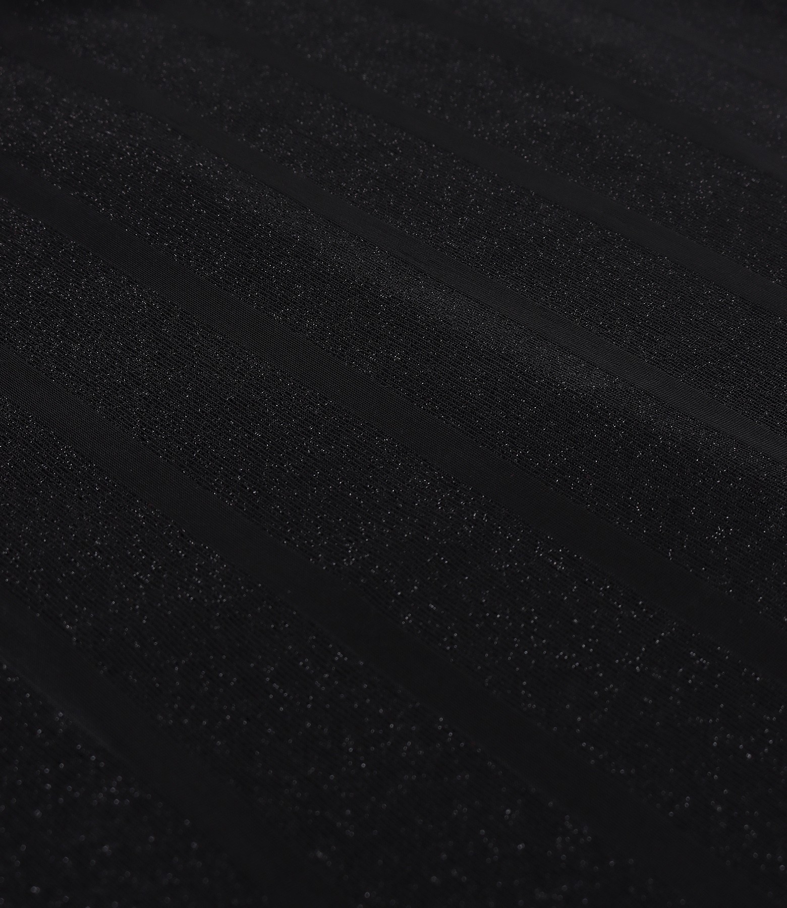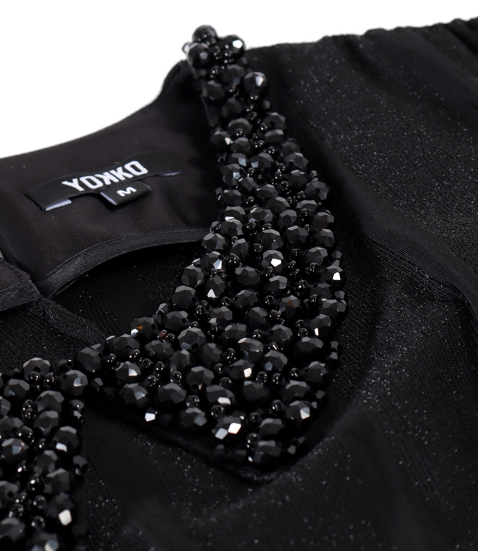 Elegant dress made of viscose jersey with metallic thread and tone-on-tone stripes, padded polyester jersey, with closed sleeves, precious collar beaded, and waist marked with white pearl string. It closes with a button on the middle back.