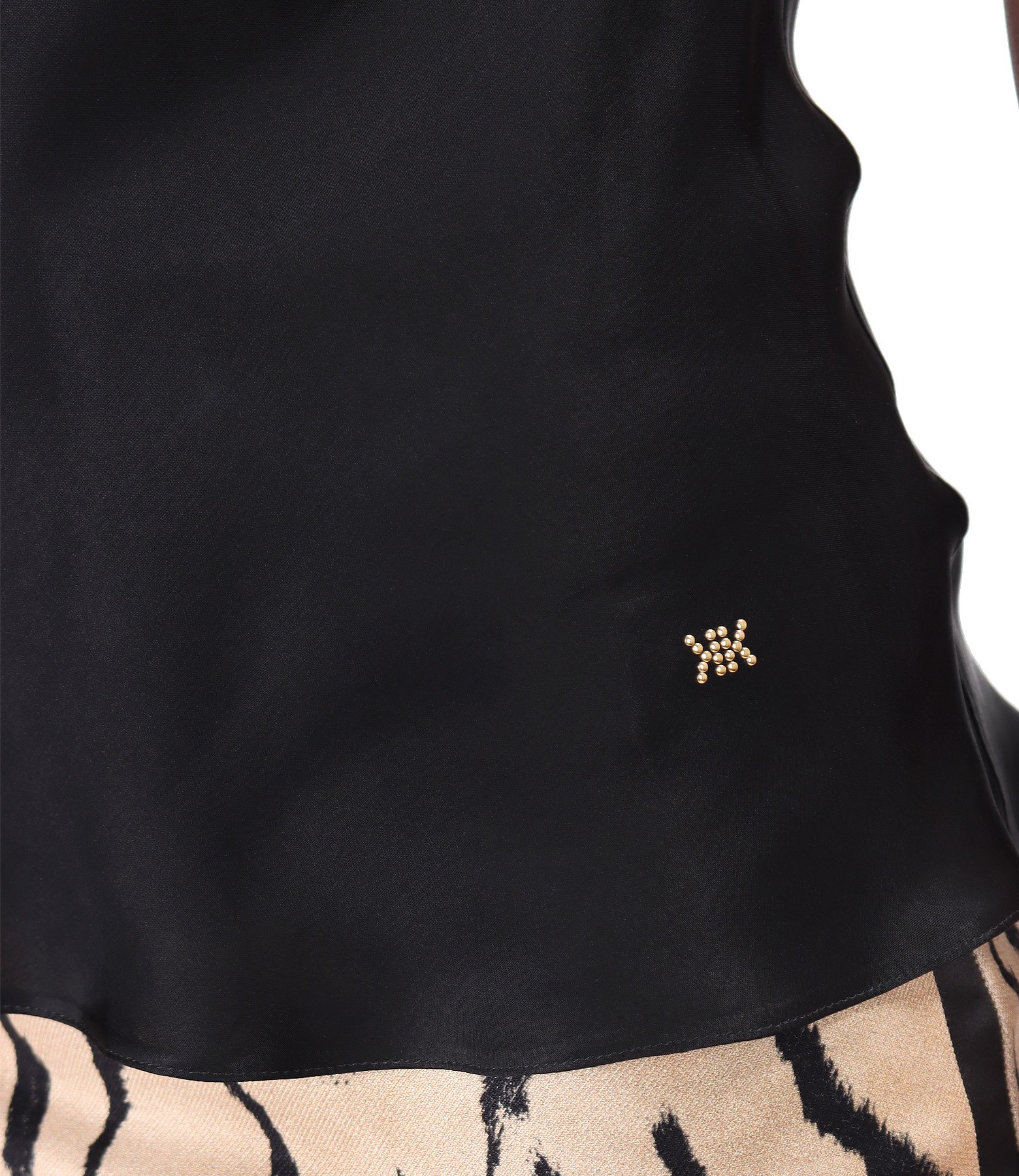 Elegant viscose satin blouse, without sleeves and with pleats at the neckline. On the shoulder, it has a fastening system to hide the bra strap.