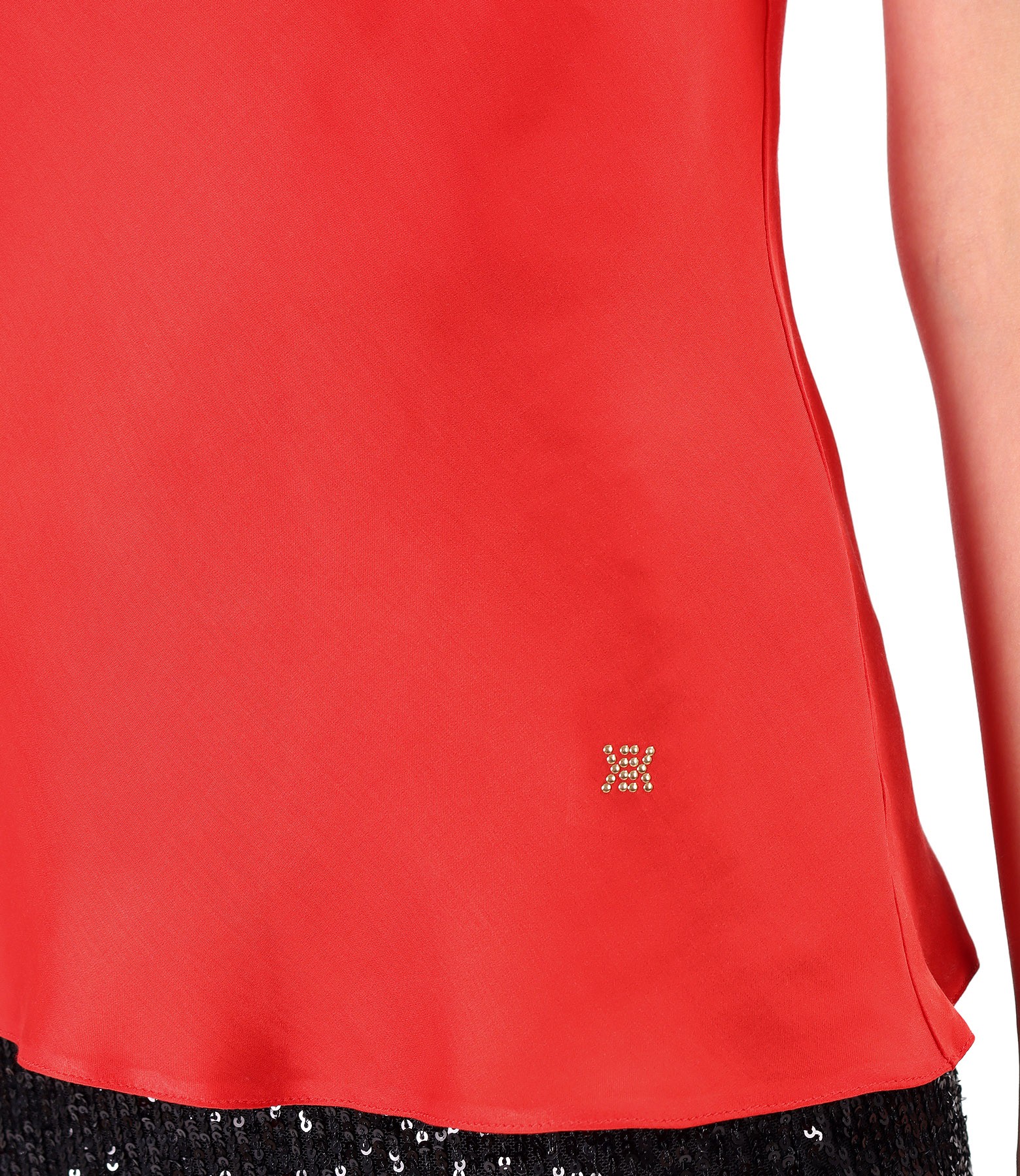 Elegant viscose satin blouse, without sleeves and with pleats at the neckline. On the shoulder, it has a fastening system to hide the bra strap.