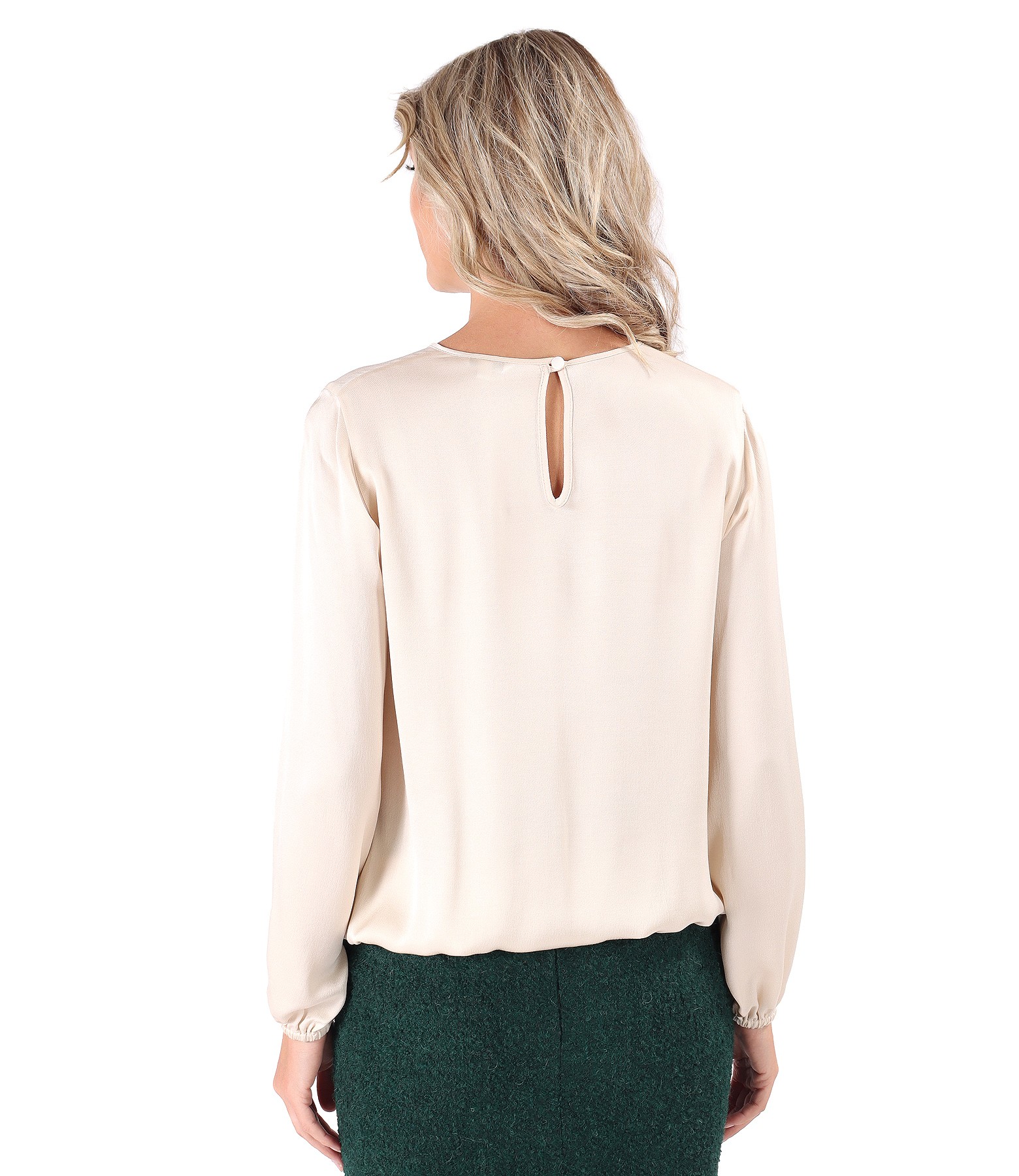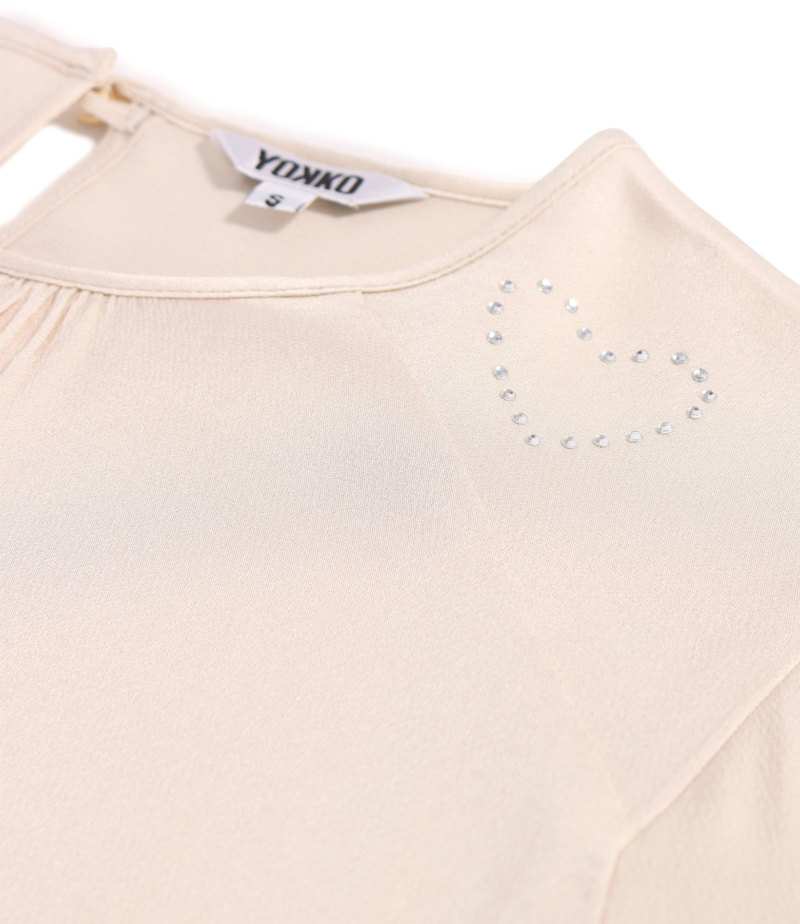 Elegant blouse made of slightly satin viscose, with long sleeves with elastic, with an elastic finish at the waist and decorative application in the shape of a heart at the neckline. It closes with a pearl button on the middle of the back.