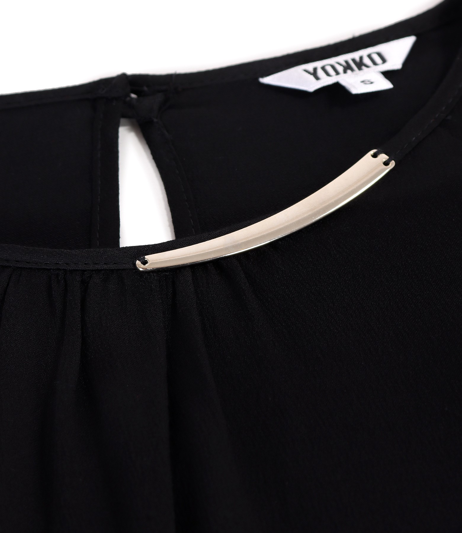 Elegant blouse made of slightly satin viscose, with long sleeves with elastic, with elastic finish at the waist and metallic application at the neckline. Closes with a button on the middle back.