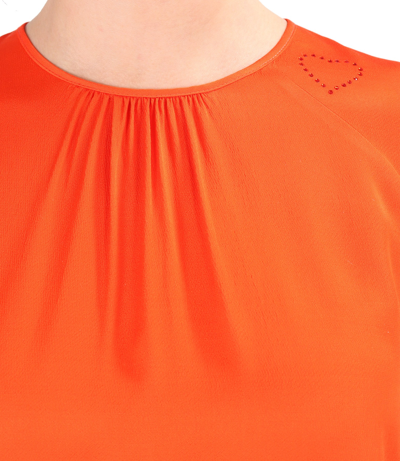 Elegant blouse made of slightly satin viscose, with long sleeves with elastic, with an elastic finish at the waist and decorative application in the shape of a heart at the neckline. It closes with a button on the middle of the back.